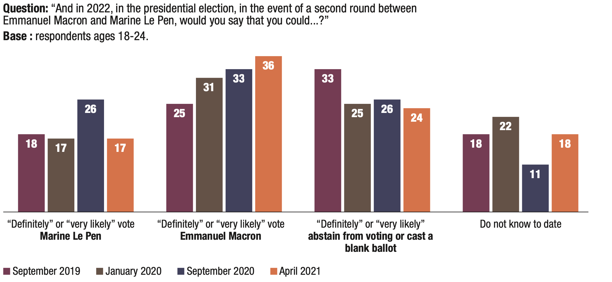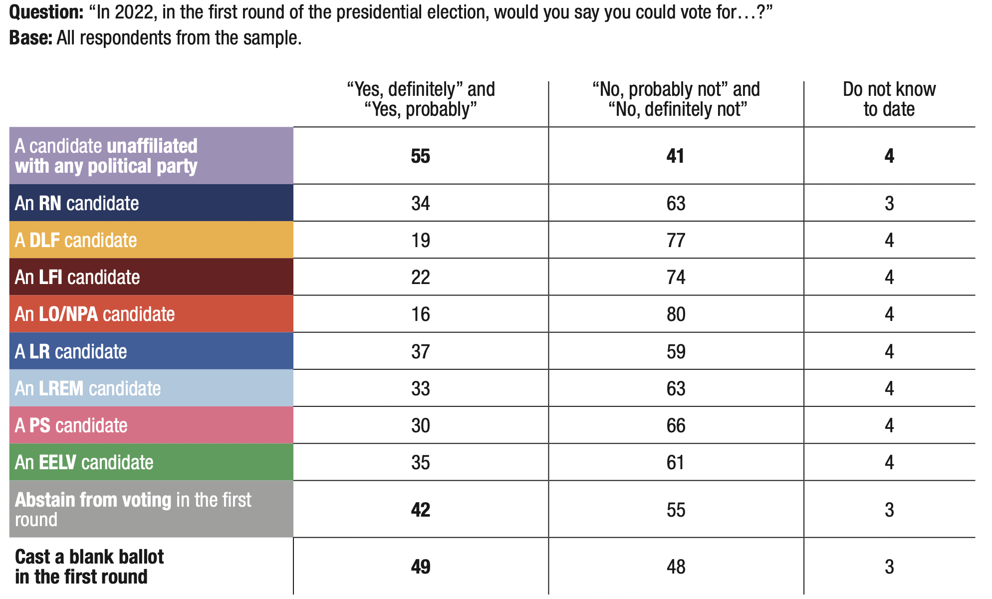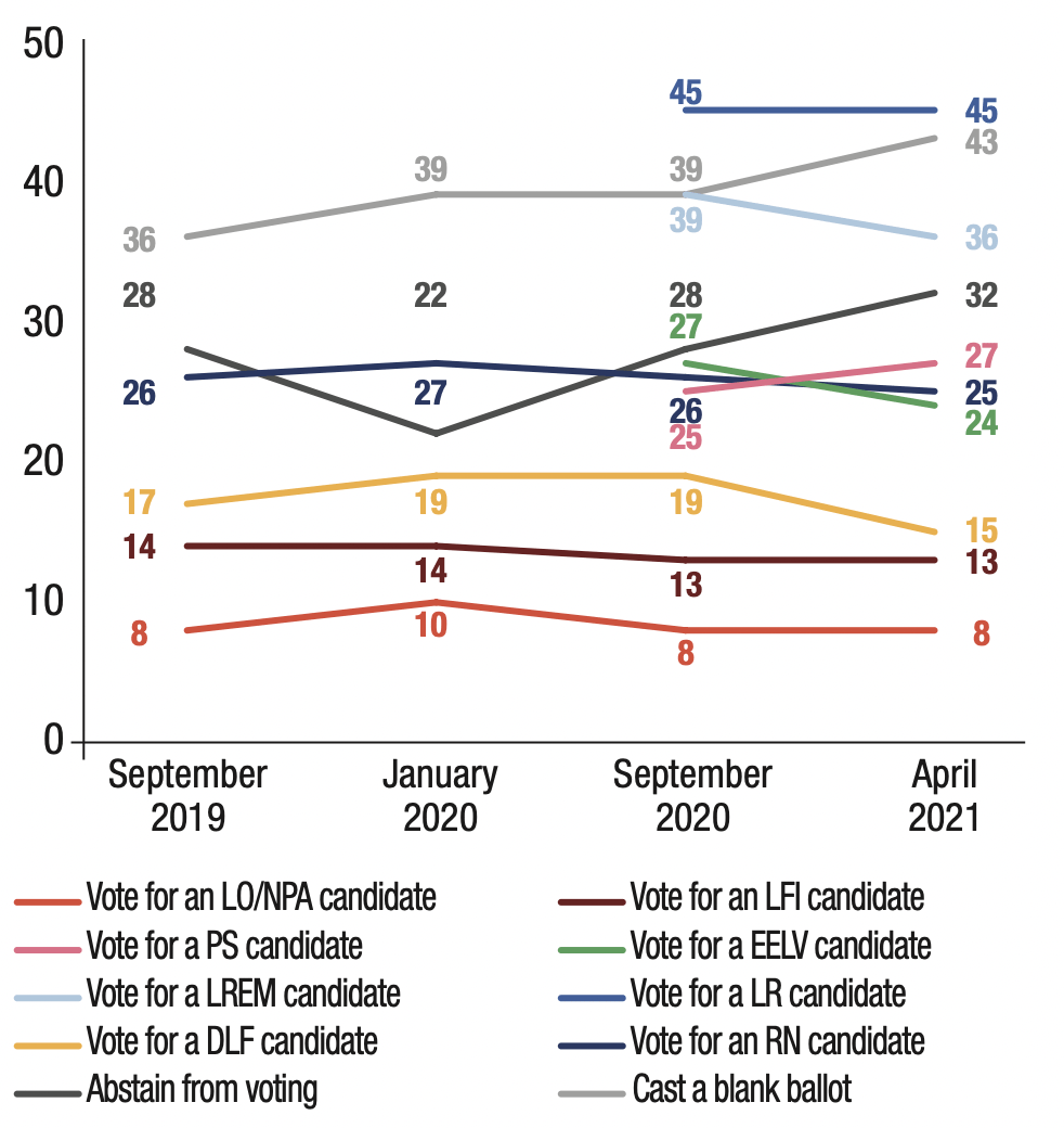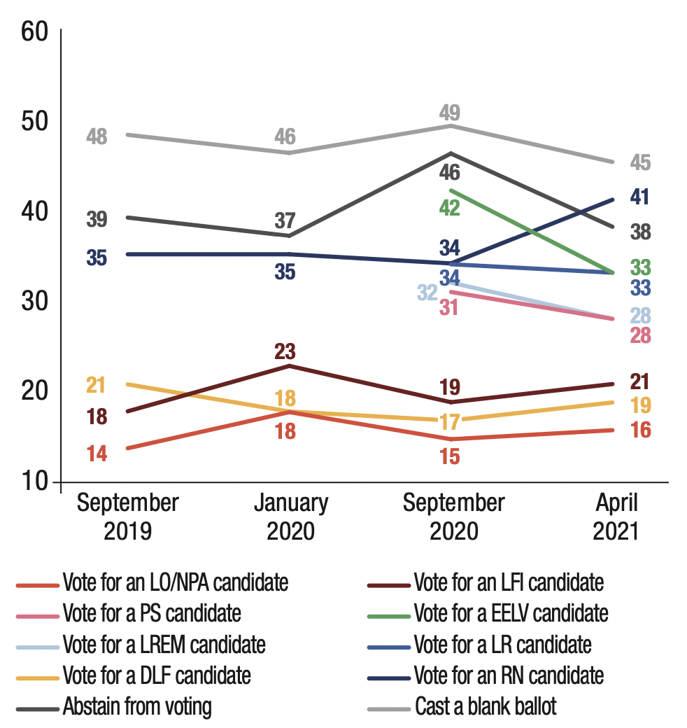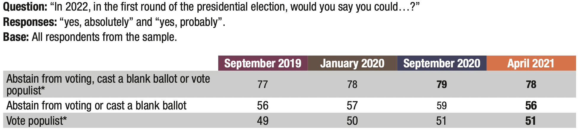 3. The proportion of respondents who said they might abstain from voting or leave their ballot blank in the first round of the 2022 presidential election remains very high (56%), but is nevertheless down 3 points compared to the previous wave in September 2020 (59%).