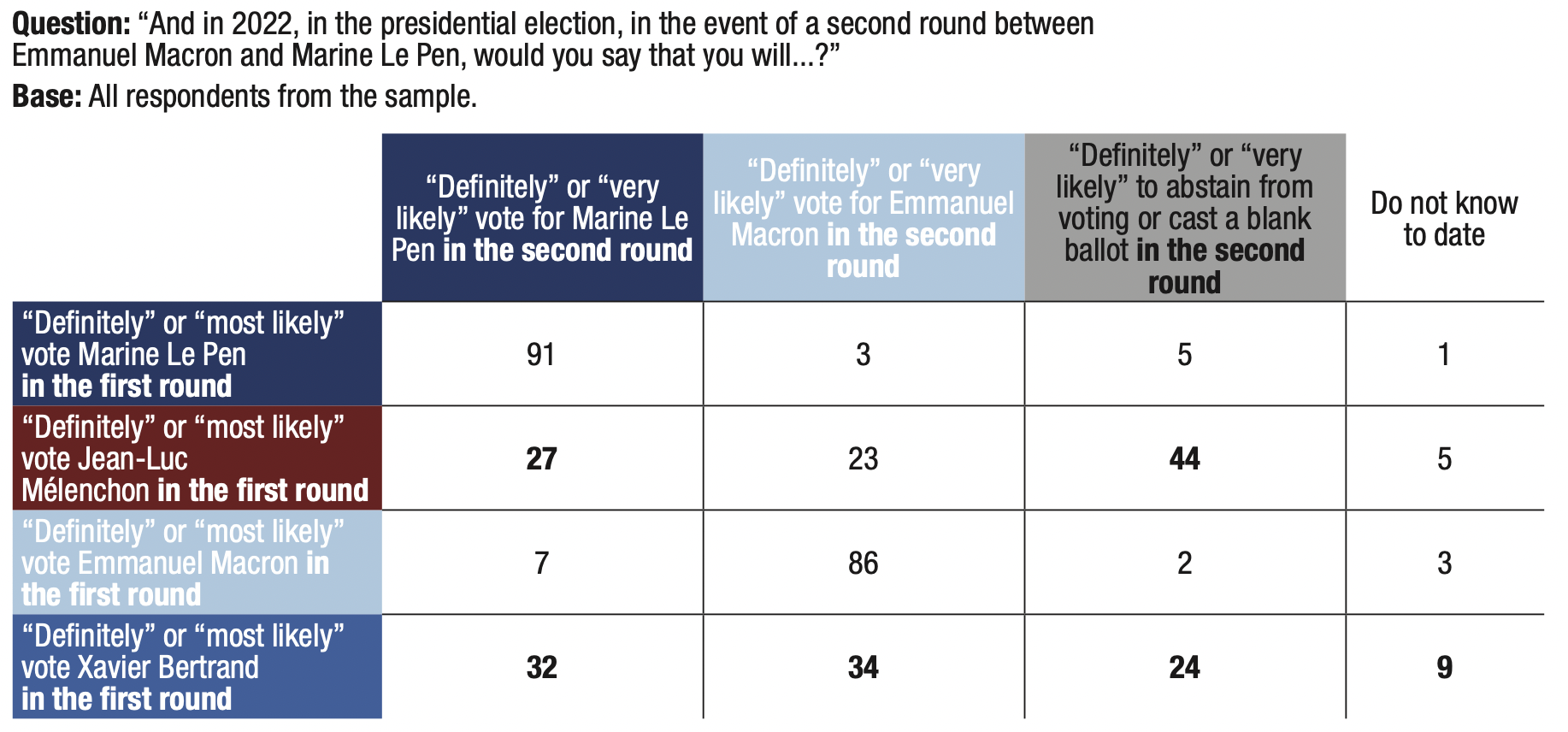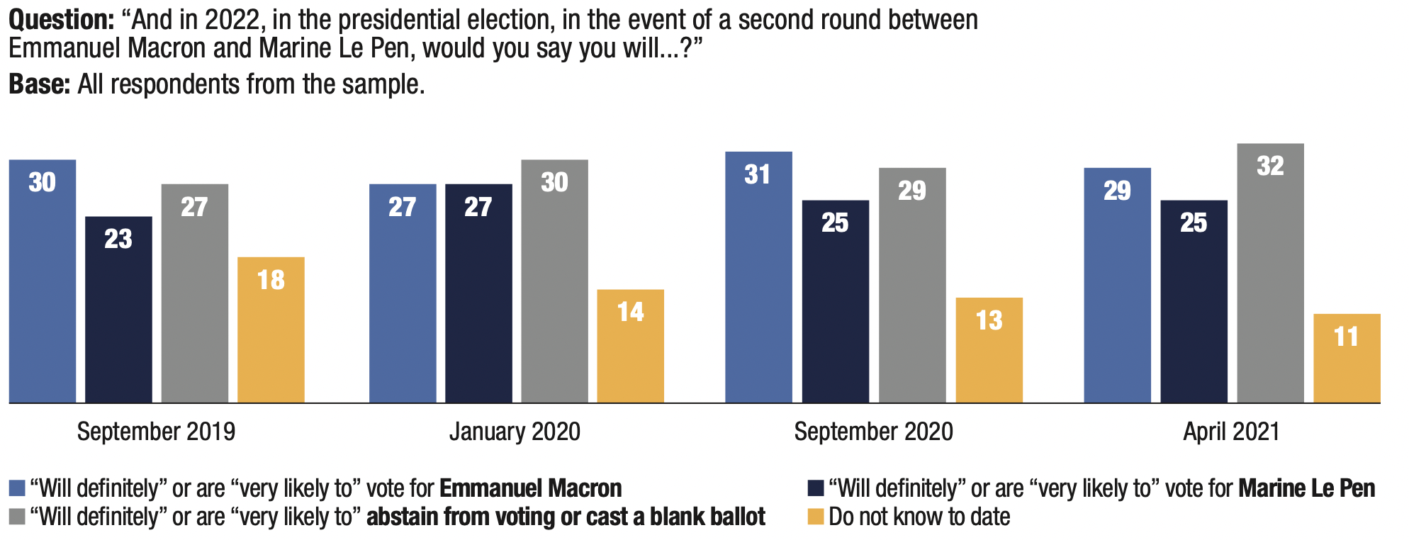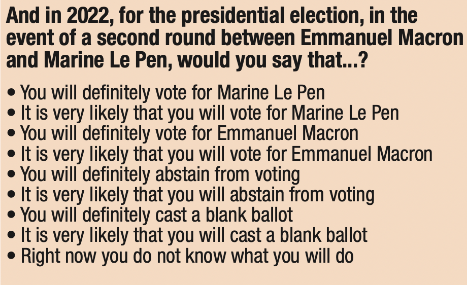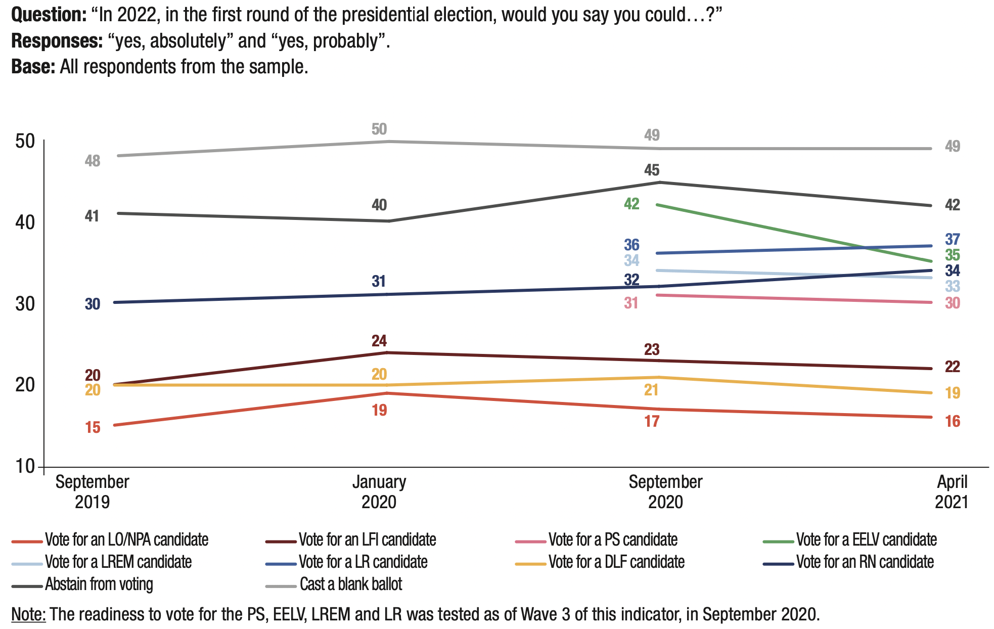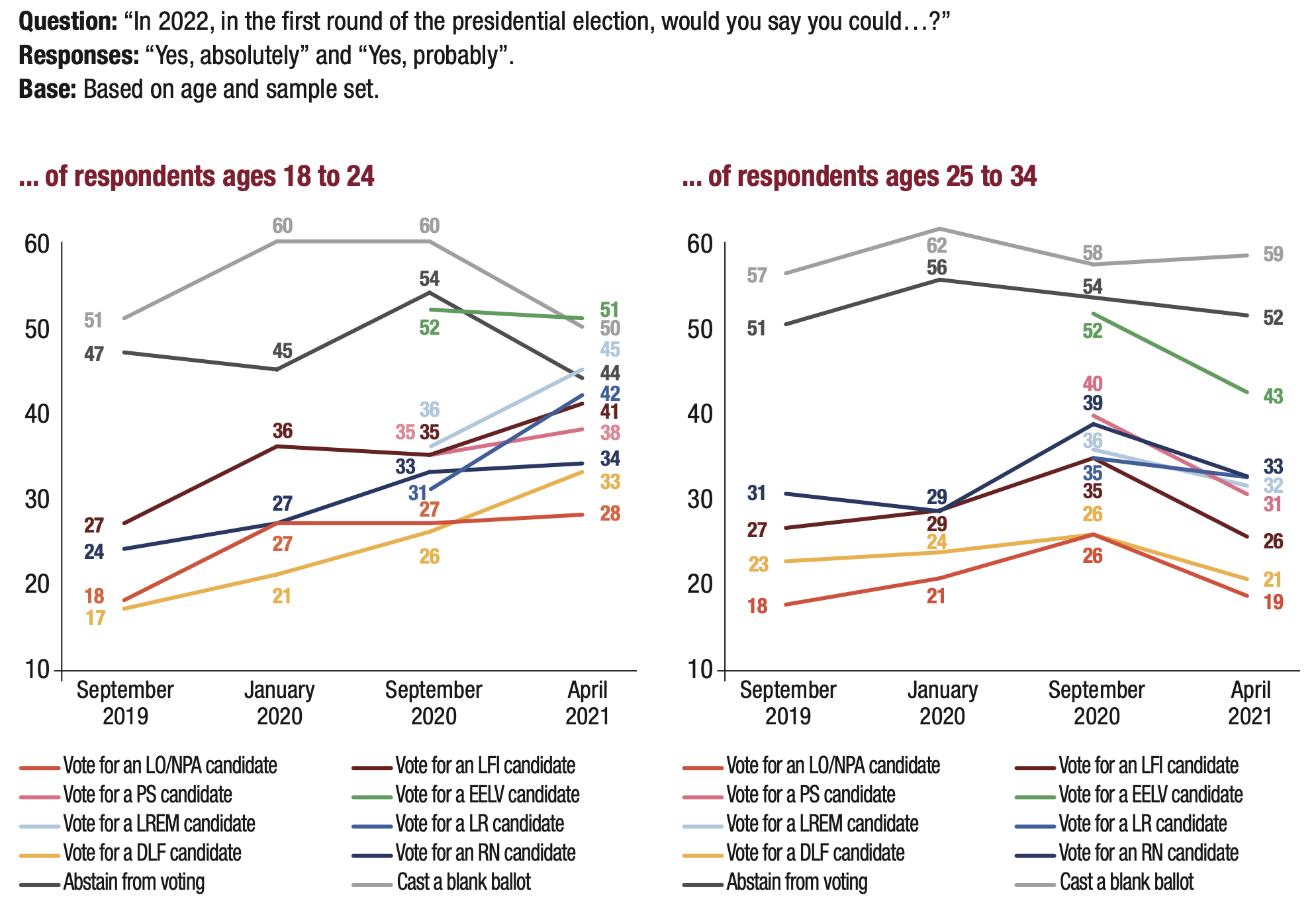 3. The proportion of respondents who said they might abstain from voting or leave their ballot blank in the first round of the 2022 presidential election remains very high (56%), but is nevertheless down 3 points compared to the previous wave in September 2020 (59%).