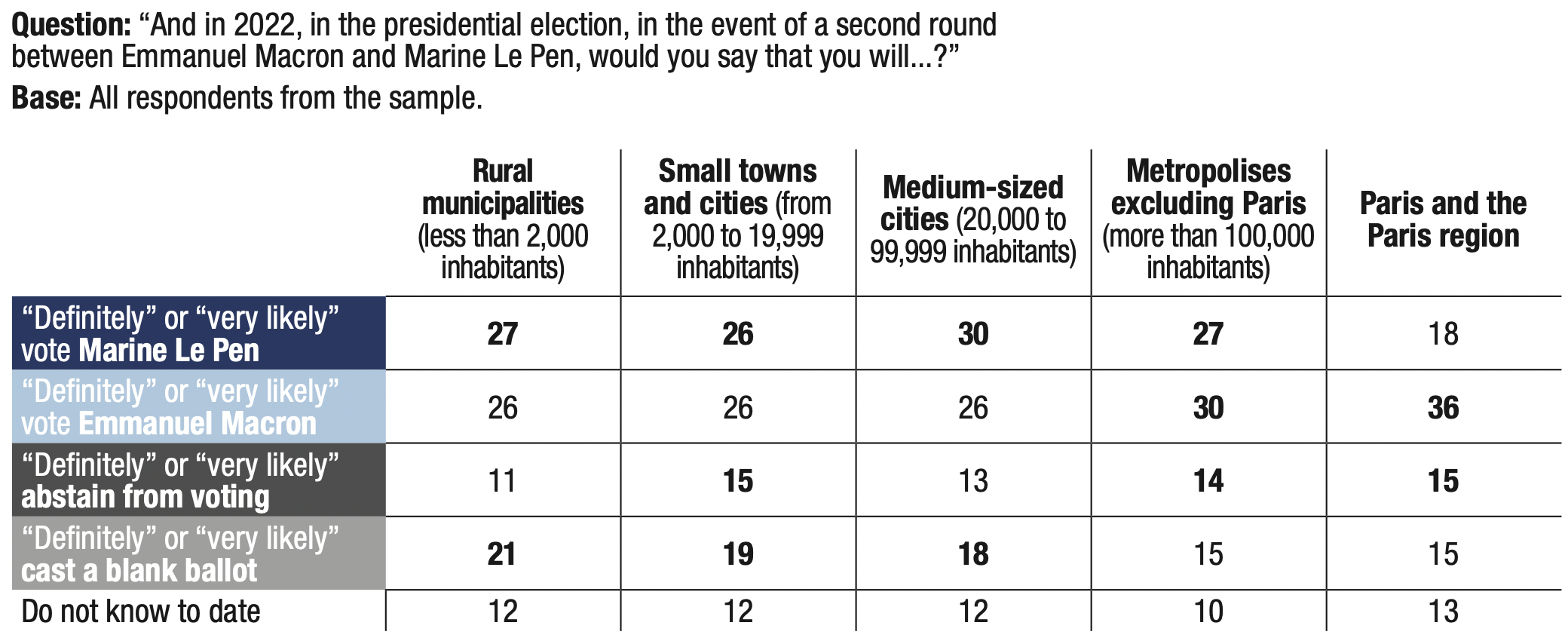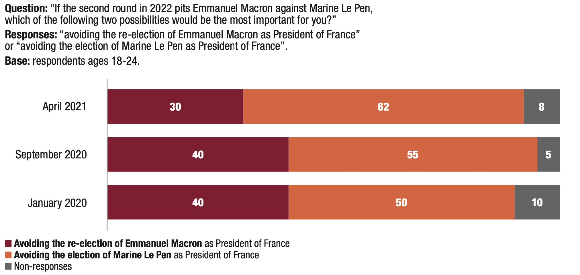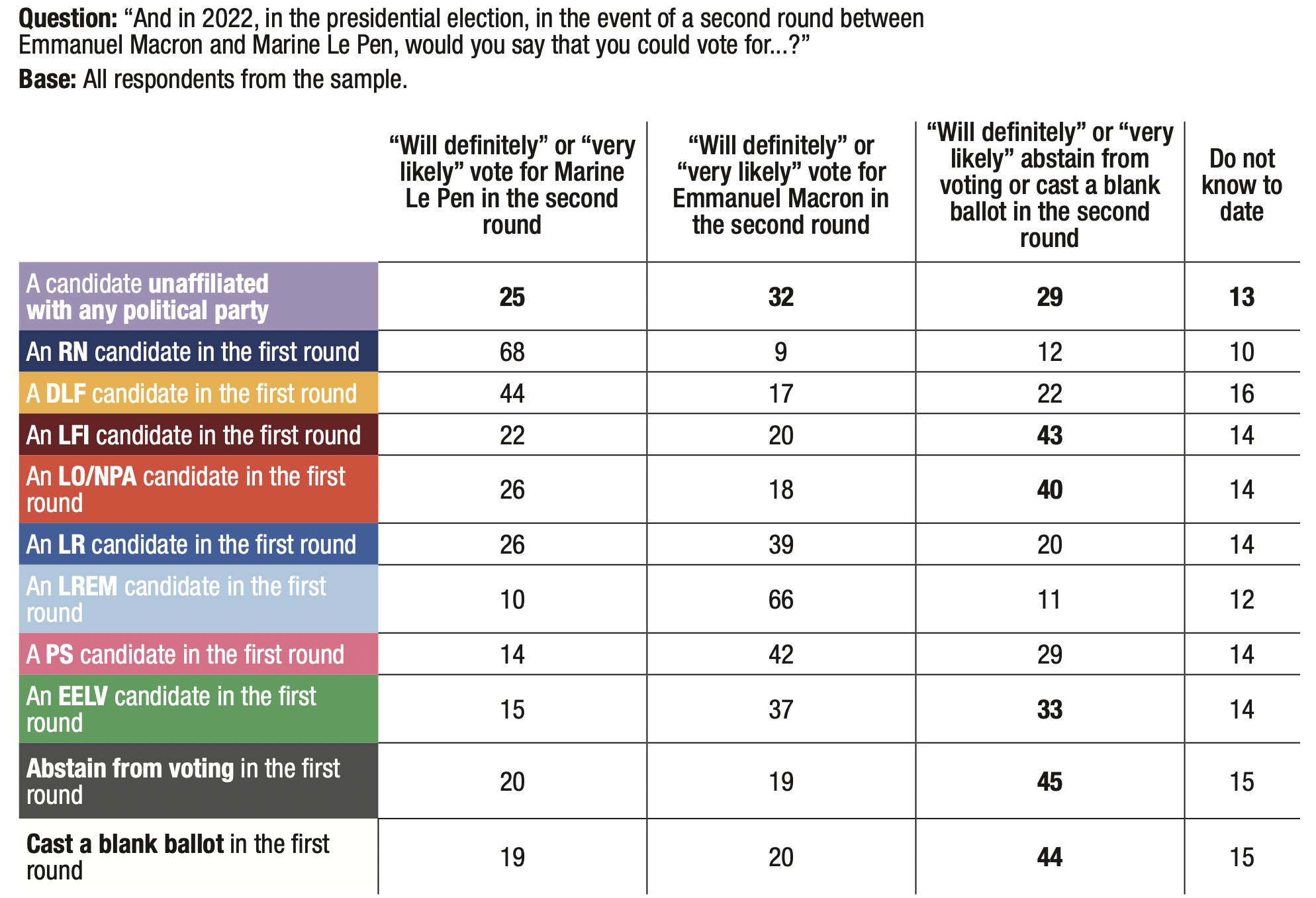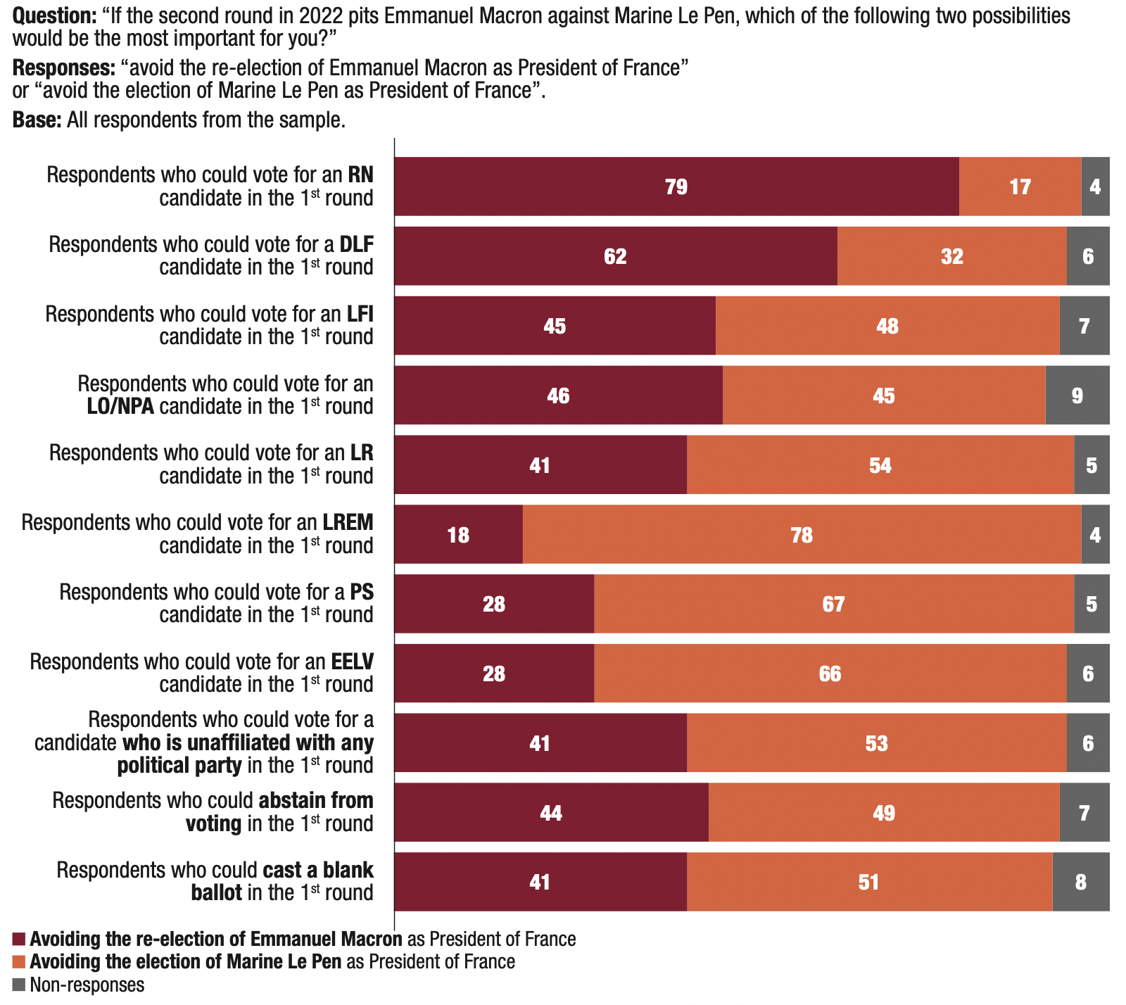 3. The proportion of respondents who said they might abstain from voting or leave their ballot blank in the first round of the 2022 presidential election remains very high (56%), but is nevertheless down 3 points compared to the previous wave in September 2020 (59%).