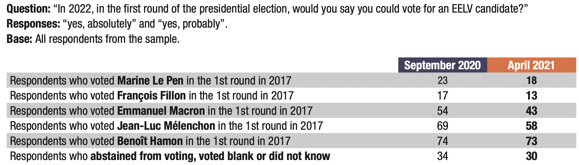 The readiness to vote EELV remains high but has fallen sharply, by 7 points, from 42% in September 2020 to 35% in April 2021.