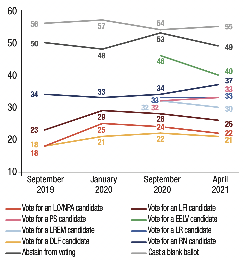 The readiness to vote PS (30%, compared to 31% in September 2020) and the readiness to vote LREM (33%, compared to 34% in September 2020) are also stable, though at a lower level.