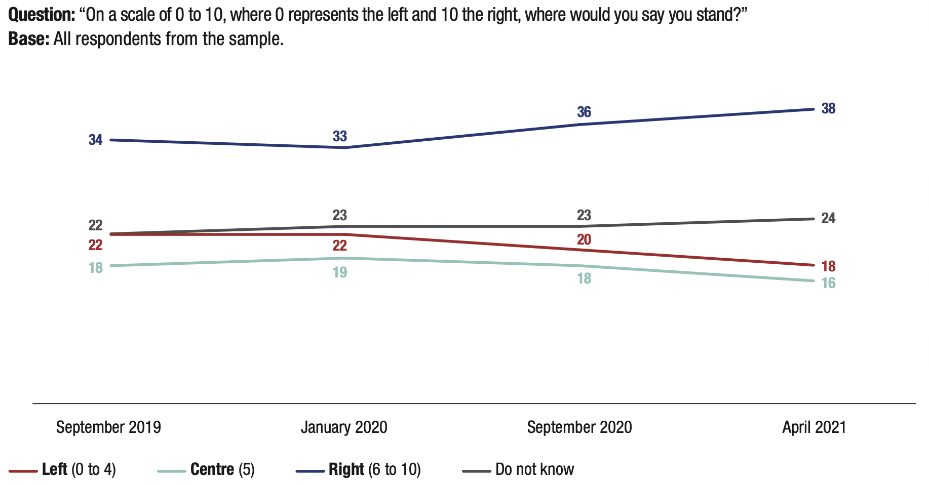 10. The shift to the right amongst young people is consolidating: while 23% of 18-24 year olds self- positioned themselves as right-wing (levels 6 to 10 on the left-right scale) in January 2020, 27% of them did so in September 2020 and 33% in April 2021, i.e. an increase of 10 points in fourteen months. Conversely, fewer young people self-positioned in the centre (19% in January 2020, 10% in April 2021) and the left-wing (18% in January 2020, 16% in April 2021).