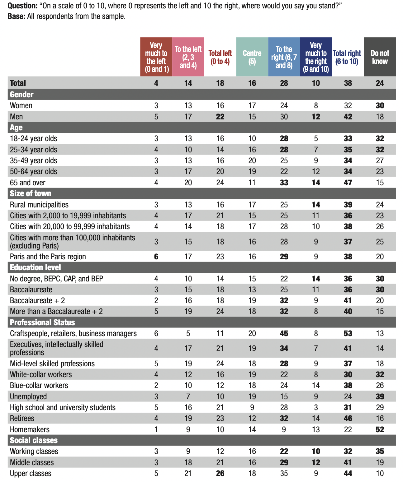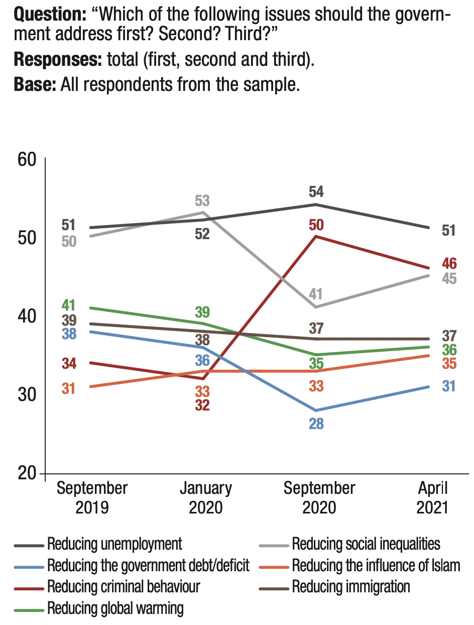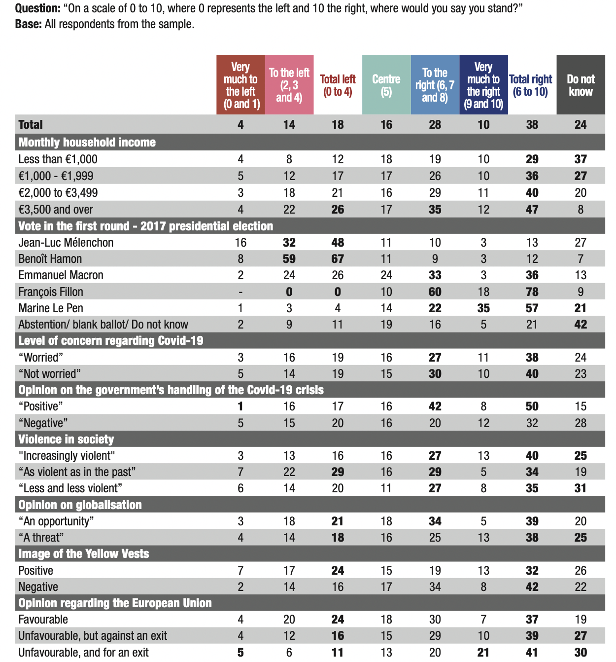 9. Almost four out of ten French people (38%) self- position themselves as right-wing (levels 6 to 10 on the left-right scale). Only 18% self-position themselves as left-wing (levels 0 to 4), while 16% position themselves in the centre (level 5). One-quarter (24%) of respondents did not self-position themselves on the left-right axis. Since September 2019, the proportion of respondents self-positioning as right-wing has increased by 4 points, from 34% to 38%. Over the same period, the proportion of respondents describing themselves as left- wing experienced a shift of the same magnitude, but in the opposite direction, as the proportion of those self- positioning as left-wing decreased from 22% to 18%. The right-wing’s lead over the left-wing, which amounted to 12 points in September 2019, increased to 20 points in April 2021.
