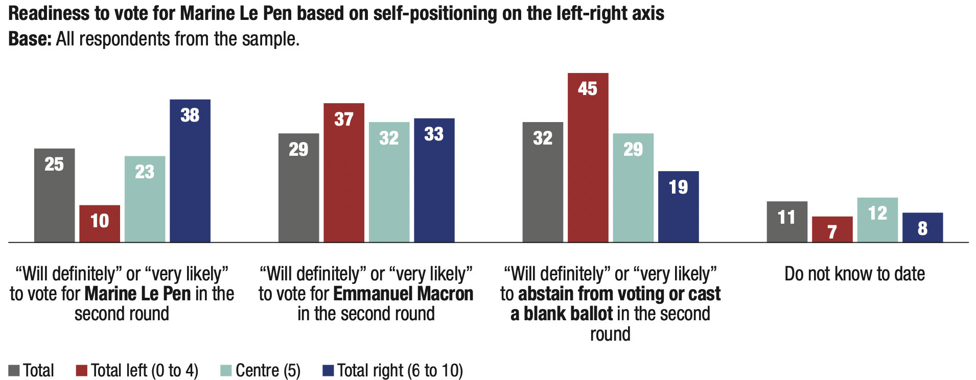 11. Faced with the possibility of a second round between Emmanuel Macron and Marine Le Pen, voters self-positioning as right-wing are significantly more likely to “definitely” or “very likely” vote for the RN candidate (38%) than to vote for the incumbent president (33%).