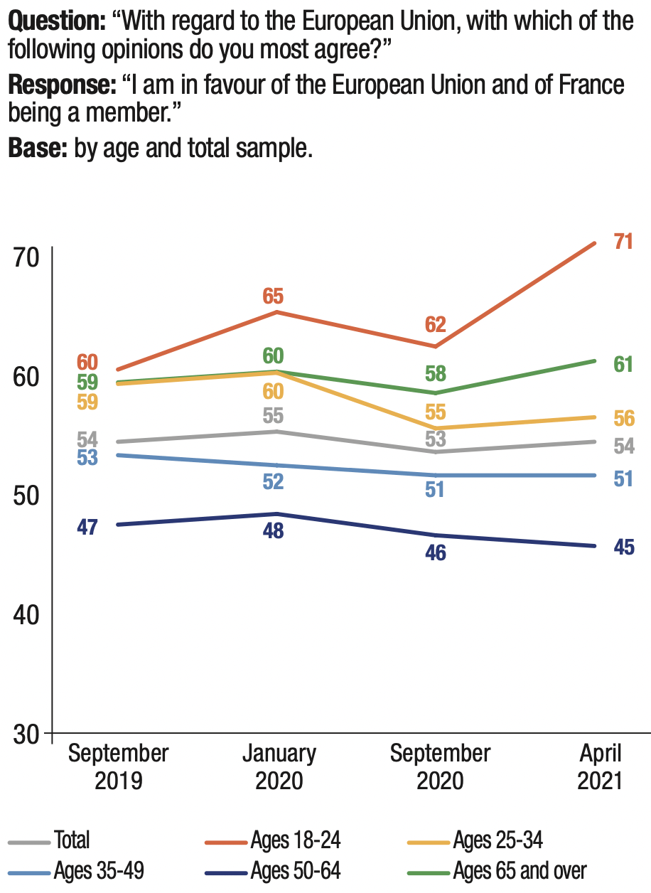12. The majority (59%) of those who “will definitely” or “very likely” vote for Marine Le Pen in the first round in 2022 do not want France to leave the European Union; an even larger majority (68%) want to keep the euro as France’s currency. Almost all of those who “will definitely” or “very likely” vote for Jean-Luc Mélenchon do not want their country to leave Europe (85%) or the euro (84%).