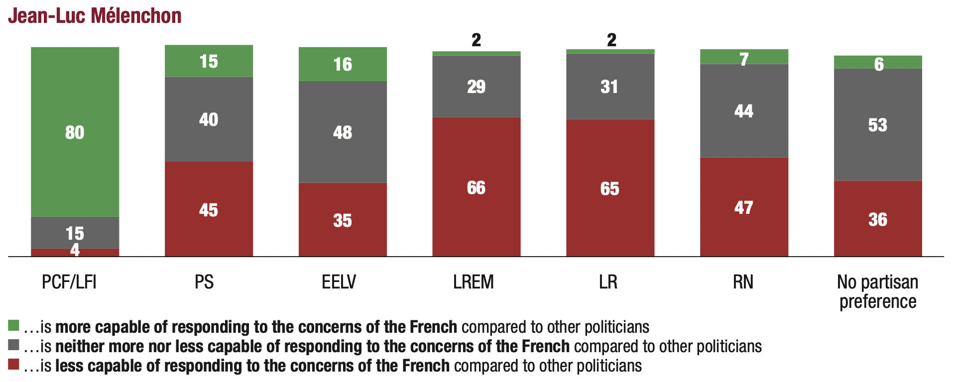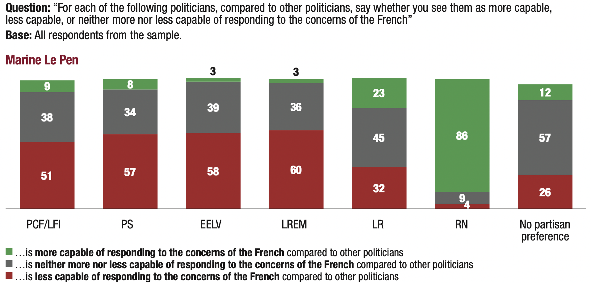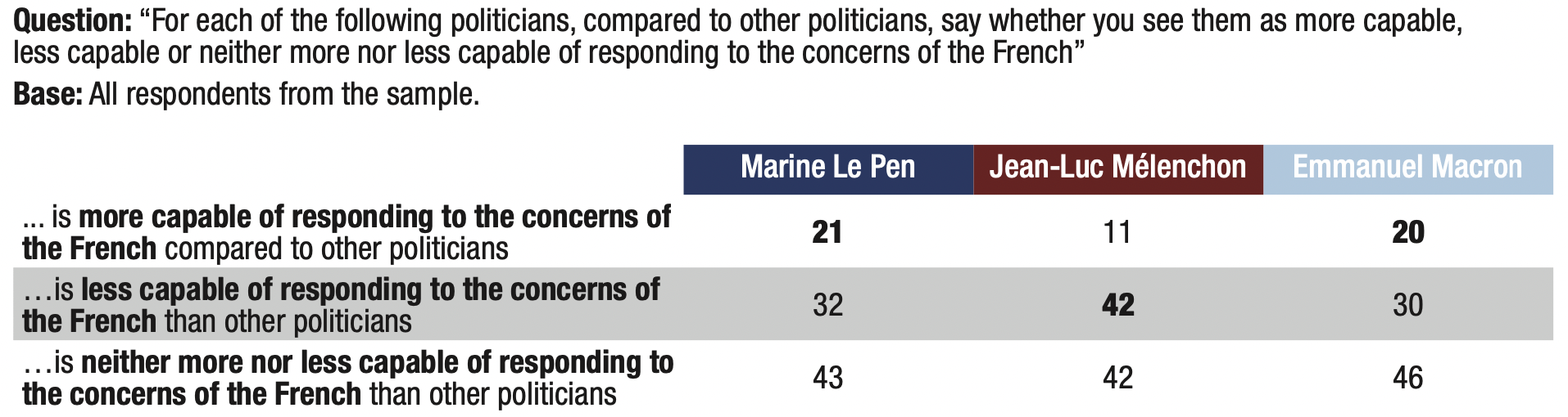 14. The erosion of the privilege of competence granted to governing parties reduces the handicap of populist parties. This trend is particularly favourable to Marine Le Pen: 21% of those surveyed considered her “more capable of responding to the concerns of the French” than “other politicians”. This proportion is the same (20%) with regard to Emmanuel Macron. In contrast, only 11% of respondents deemed Jean-Luc Mélenchon “more capable of responding to the concerns of the French” than “other politicians”.