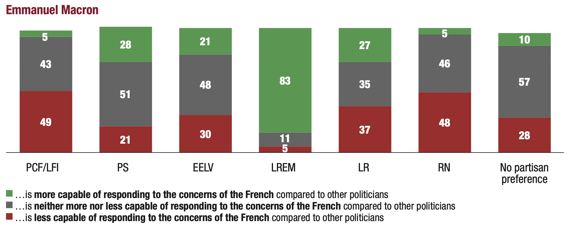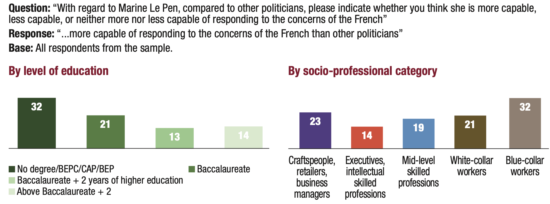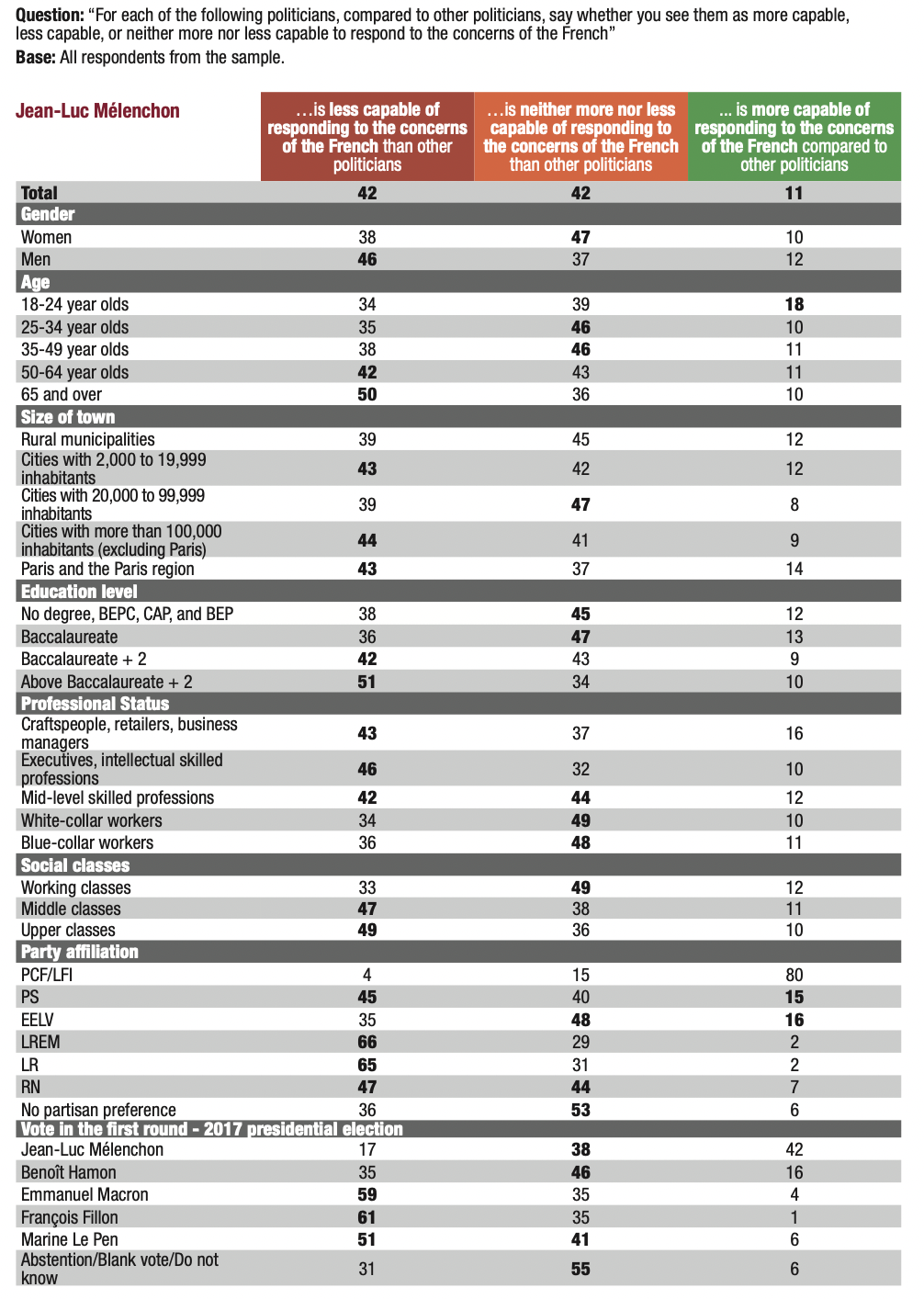 14. The erosion of the privilege of competence granted to governing parties reduces the handicap of populist parties. This trend is particularly favourable to Marine Le Pen: 21% of those surveyed considered her “more capable of responding to the concerns of the French” than “other politicians”. This proportion is the same (20%) with regard to Emmanuel Macron. In contrast, only 11% of respondents deemed Jean-Luc Mélenchon “more capable of responding to the concerns of the French” than “other politicians”.