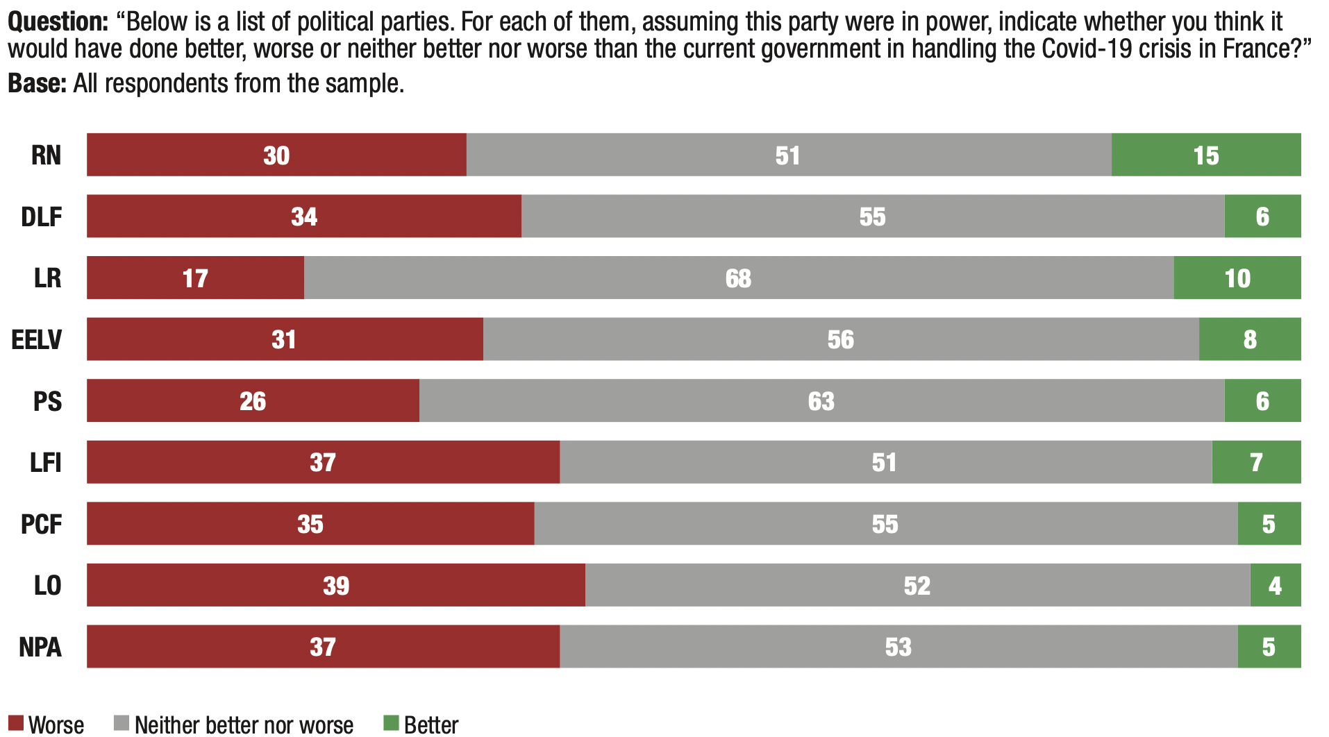 17. Here is a list of political parties. For each of them, if they were in power, indicate if you think they would have done better, worse or neither better nor worse than the current government in managing the Covid-19 crisis in France?