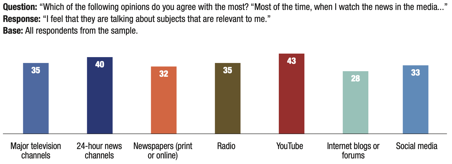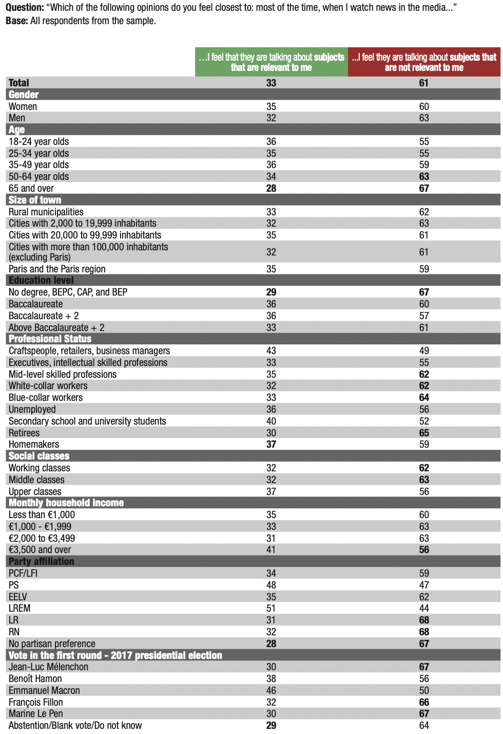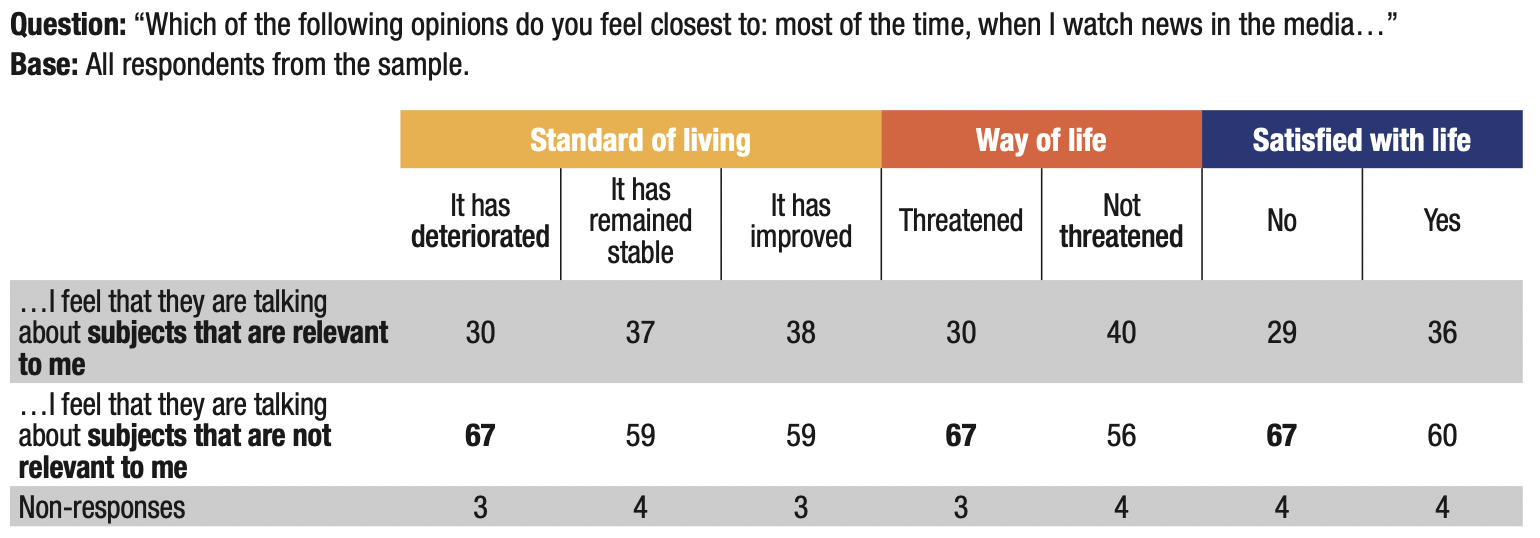 20. The media’s depiction is challenged: 61% of those surveyed feel that the media “talk about subjects that are not relevant to them”. One-third of respondents (33%) feel that the media deal with subjects that are relevant to them (and 6% did not respond).