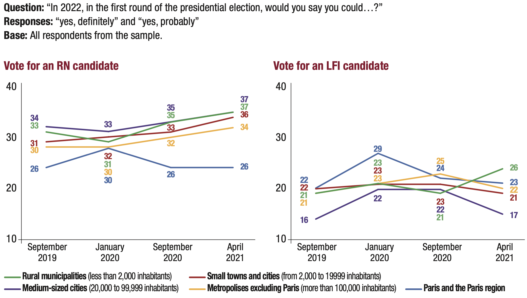 4. As pertains to voters’ readiness to vote for a party, and no longer for a declared candidate, we note an increase in the readiness to vote for the RN in the first round of the 2022 presidential election, i.e. an increase of 4 points, from 30% in September 2019 to 34% in April 2021. On the other end of the political spectrum, LFI remains at a level close to that of September 2019: 22% in April 2021, compared to 20% in September 2019.