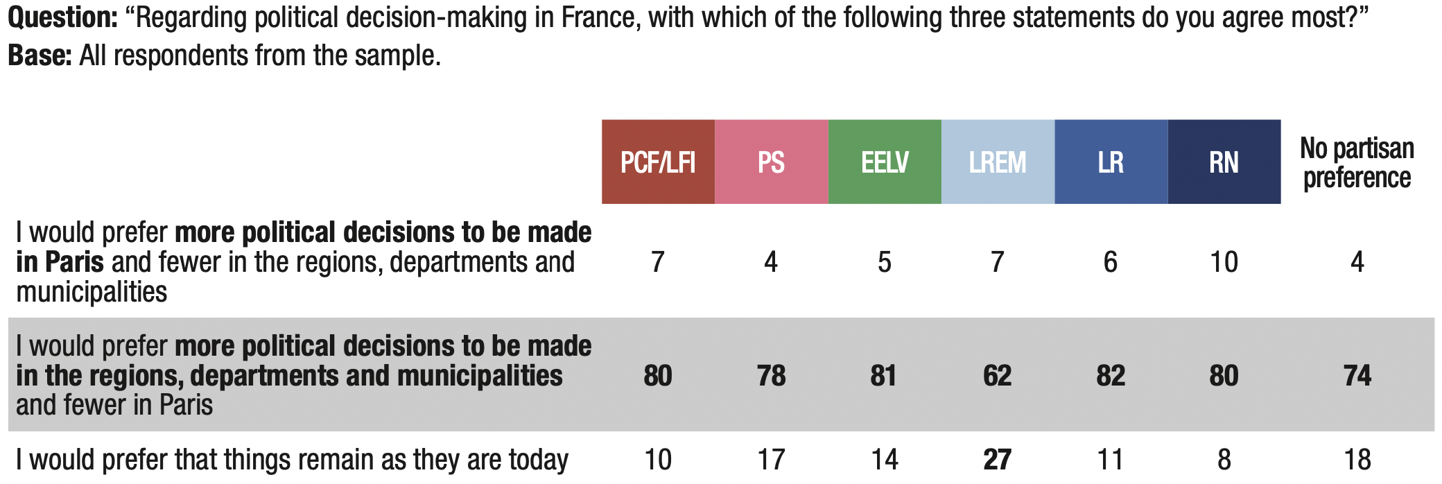 • I would prefer more political decisions to be made in Paris and fewer in the regions, departments and municipalities