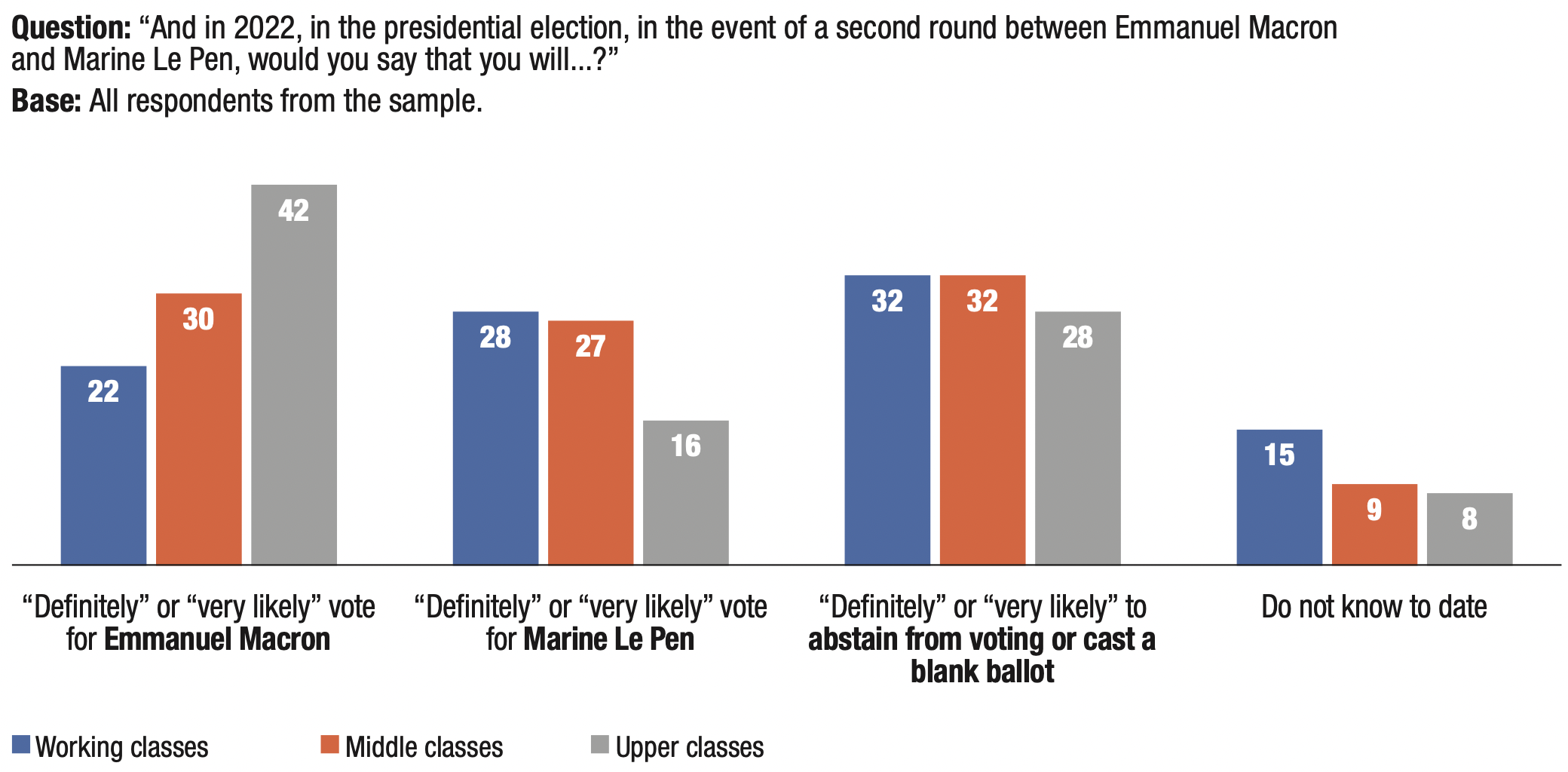 26. One-fifth of working-class (22%) and middle- class (21%) respondents said they “will definitely”or “very likely” vote for Marine Le Pen in the first round of the presidential election, compared to 12% of upper class respondents.