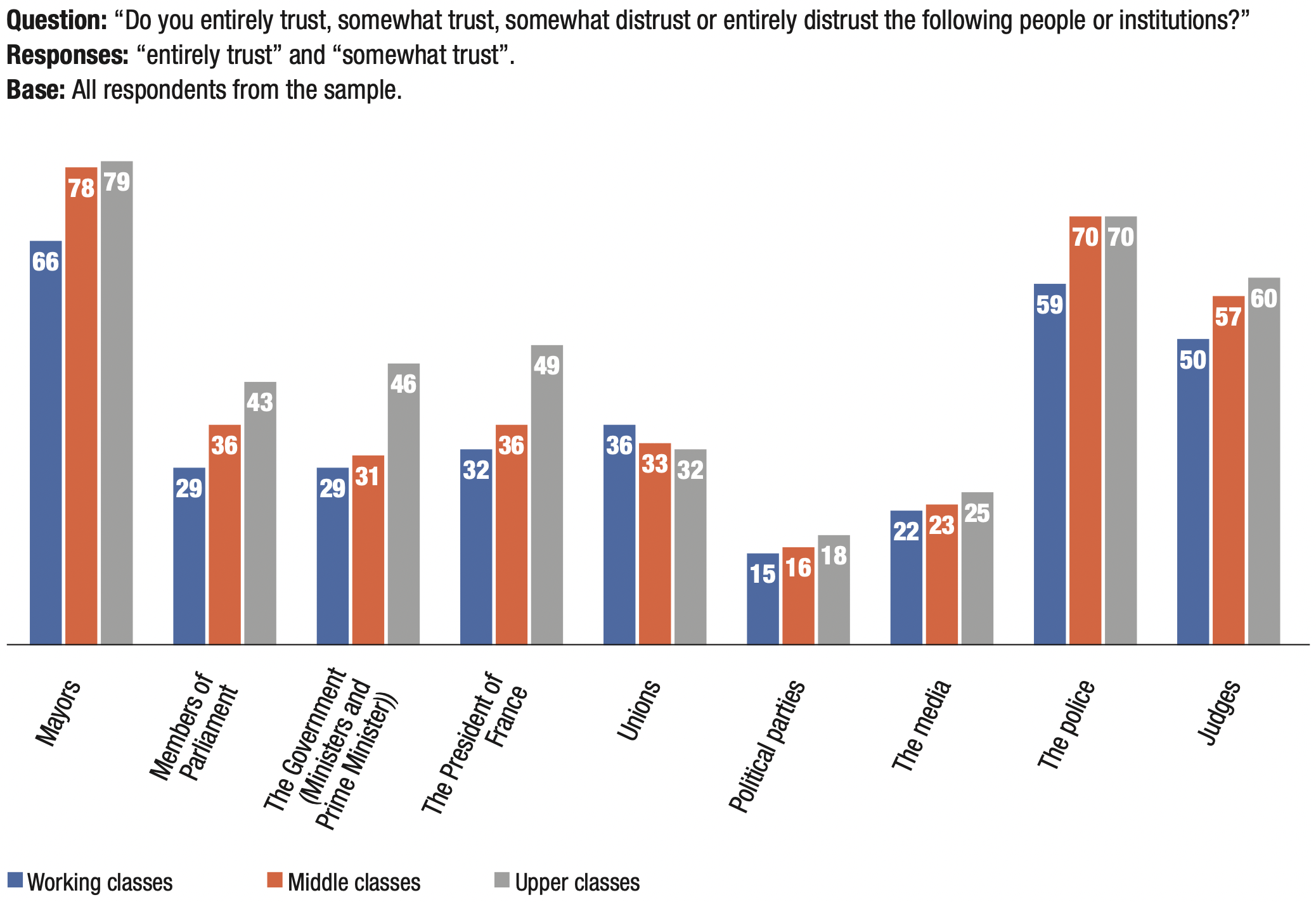 23. The distrust in institutions and the political system persists: 80% do not trust the political parties, 64% the government, 62% unions, 61% members of Parliament and 60% the President of France. Mayors (23%), police officers (30%) and judges (42%) manage to keep their heads above water with a minority of people distrusting them.