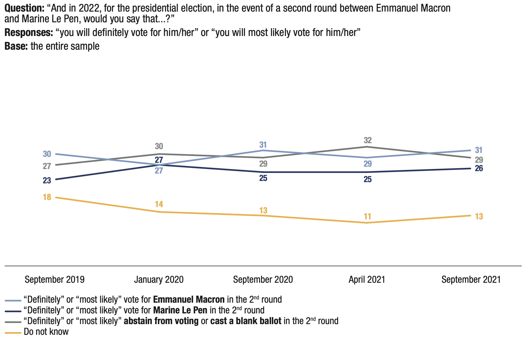 7. In the event of a second round between Emmanuel Macron and Marine Le Pen, the share of people indicating that they will “definitely” or “most likely” vote for the RN candidate amounts to 26%, the second highest result after that of wave 2 (27% in January 2020). At the same time, the share of respondents who are “definitely” or “most likely” to vote for the incumbent president is at 31%, its highest result, on par with that of wave 3 in September 2020 (31%). The proportion of those who could abstain from voting or cast a blank ballot fell by three points, from 32% in April 2021 to 29% in September 2021.