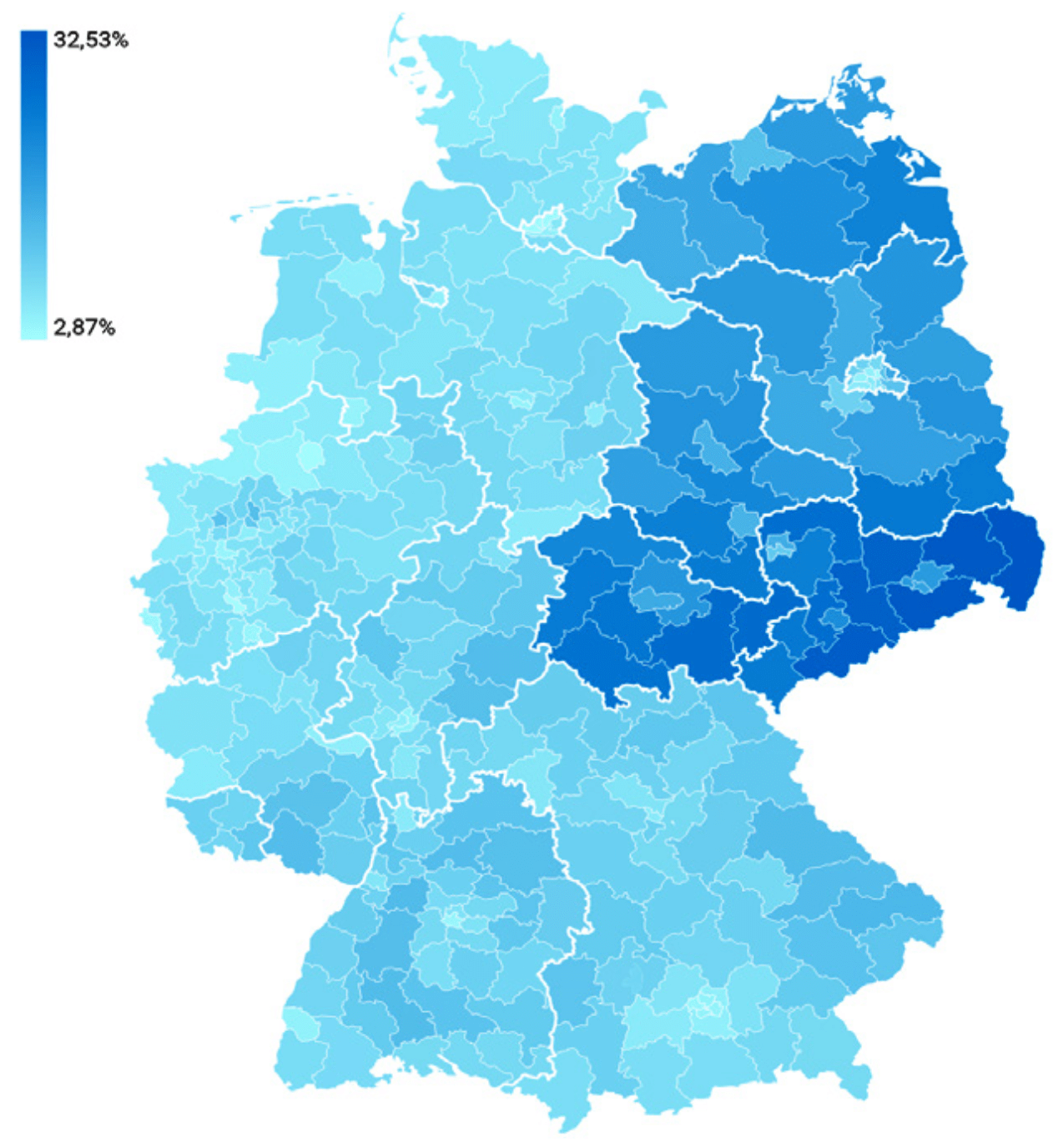 Second votes for the AfD in the 2021 Bundestag elections Zweitstimmenergebnis der AfD