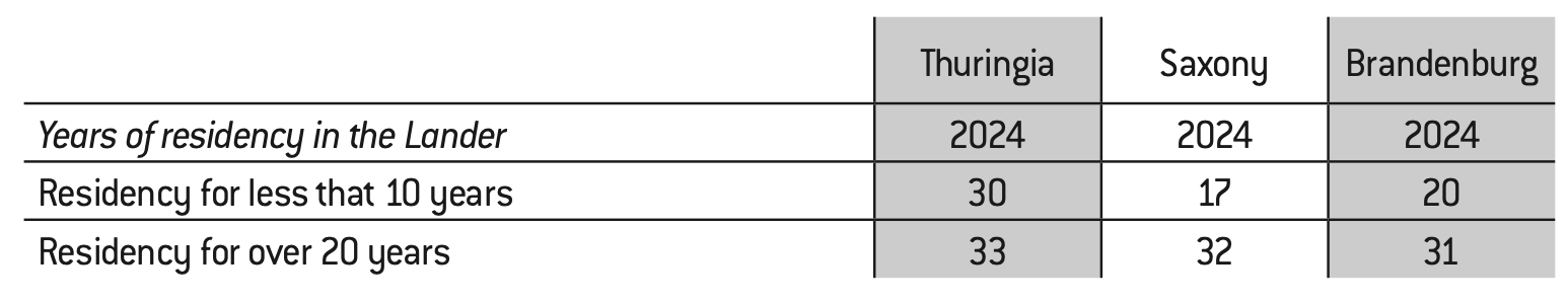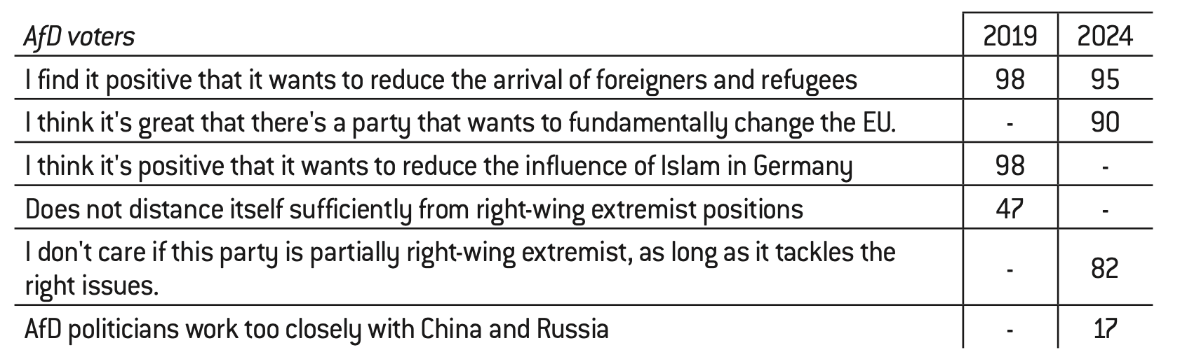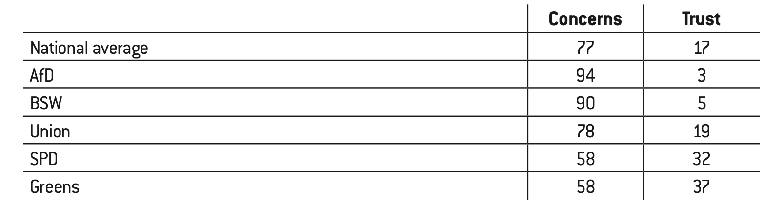 This table illustrates that the “firewall” (Brandmauer) emphasized in the traffic light coalition’s anti-fascist campaigns—and to some extent the CDU’s—appears to be weakening in the new federal states. Despite pragmatic political shifts, respondents still express caution regarding the AfD’s broader political vision.