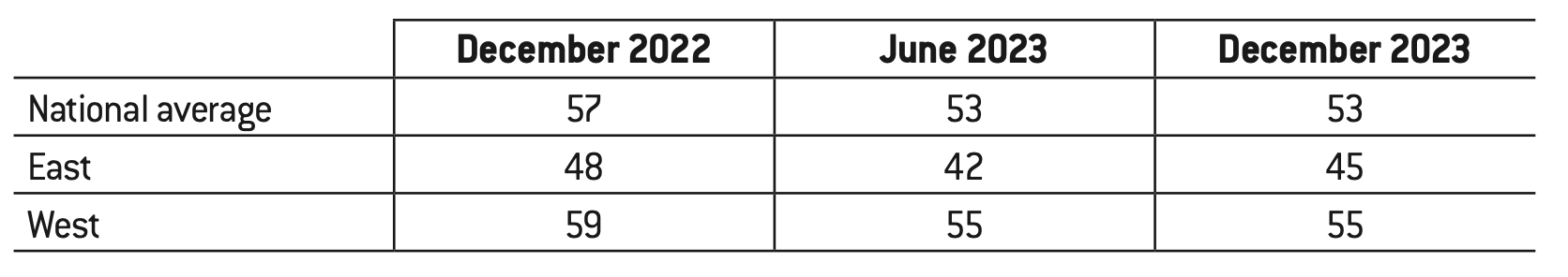 A survey has investigated the reasons for the East Germans’ (“Ossis”) mistrust—even hostility—towards the West120. Findings from the SOSEC research project’s long-term survey reveal that 50% of respondents in the East (compared to 30% in the West) believe that current crises are being used to serve the interests of the “elites” and that policies are deliberately failing to improve the public’s situation.