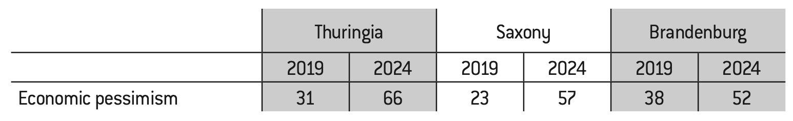 Polls indicate a striking shift in economic perceptions in the three Länder between 2019 and 2024, with a majority of respondents now expressing very negative views on the economy.