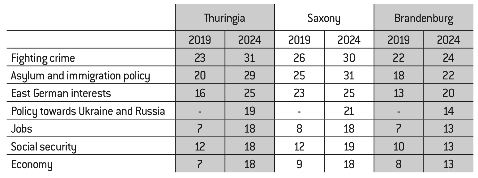 The rise in crime and recent acts of terrorism are major concerns for voters in all three Länder, with these issues strongly correlating with views on immigration. Social security (including pensions, healthcare, and transport) also weighs heavily on respondents’ minds, while climate issues hold relatively little interest. This trend helps explain the ongoing electoral decline of the Greens, as well as Die Linke, which had made climate action a central focus of its platform.