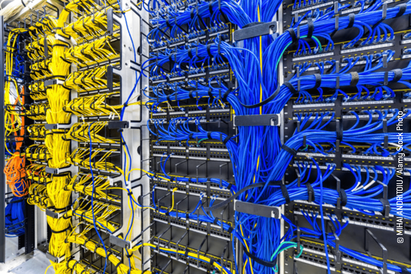 Rack equipped with standard Cat. 5e Ethernet cables, located in a large corporate data center