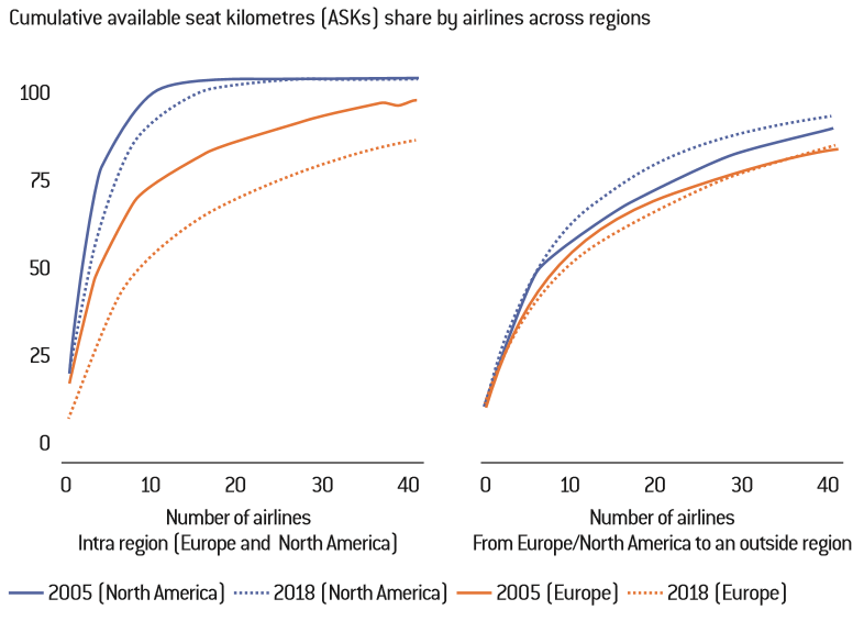In addition to the least market concentration among the top 5 of these airlines, Europe is characterised by a very large number of small players: the tail end of the size distribution is very long, once you get past the top five companies. This lower concentration appears to be particularly marked on medium-haul compared with long-haul. Indeed, on long-haul, a movement of consolidation has already taken place, in the form of alliances, joint ventures (especially on transatlantic flights), bilateral agreements, while traffic rights limit the penetration of new players.