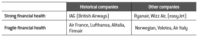 Lastly, we find some European companies that have sufficient financial strength to face the crisis. This is particularly the case in Europe of large low- cost airlines such as Ryanair, Wizz Air and to a lesser extent, easyJet, who will be able to survive on their cash flow, obtain bank loans and/or “sale and lease back” their aircrafts. Similarly, in this category we find smaller airlines such as Air Caraïbes, that have enough liquidity and may carry out a capital increase, and will probably survive the Covid-19 crisis.