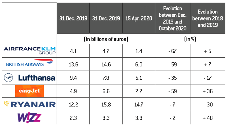 Although European airlines were hit hard by the Covid-19 crisis, not all are in the same boat both in terms of their ability to withstand it and in terms of access to public aid. Specifically, certain “flag-carrier” companies, such as Air France-KLM or Lufthansa, in a critical financial situation, were saved thanks to government support. On the other hand, a few large low-cost airlines, such as Ryanair or Wizz Air have sufficient financial strength to enable them to overcome the crisis. The situation of middle cost companies such as easy Jet appears to be more uncertain.