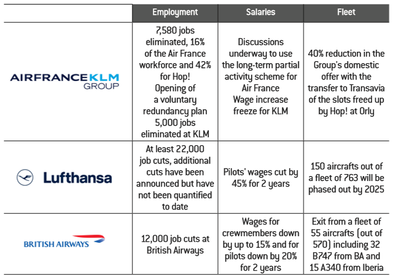 The main adjustments include staff reductions with a decrease of almost 30% (12,000 out of 42,000 employees) at British Airways and 16% at Lufthansa (22,000 out of 135,000) with discussions underway to increase the target to 30,000 employees, i.e. 22%. At the same time, Air France is planning the departure of 17% of its staff (including 42% of the Hop! staff) but has a voluntary departure plan to reduce the number of departures (3,460 positions open to voluntary departure for ground staff, 403 positions for pilots and discussions are in progress for flight personnel).