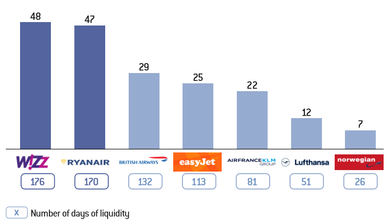 At the beginning of the Covid-19 crisis, Ryanair was in possession of liquid assets representing 47% of its annual revenue, i.e. the equivalent of 170 days of “resilience”; this figure only lasted for 81 days for Air France-KLM, i.e. less than 3 months, and only 51 days for Lufthansa. With a different methodology, Crédit Suisse arrives at a different result but which nevertheless confirms the fragility of the legacy carriers: in the absence of any measures, Lufthansa had 25 days of cash flow and Air France-KLM 69 days at the beginning of the crisis.