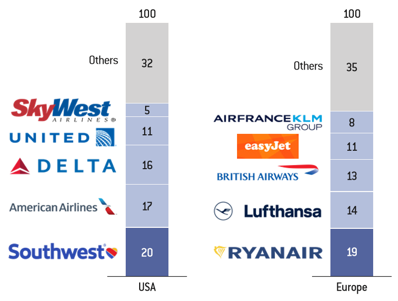 In contrast, the European market remains for the moment a little less concentrated than the American domestic market: the top four operators (Ryanair, Lufthansa group, IAG and easyJet) account for 57% of the intra- European market. It should be added that, among the four leaders in the sector in Europe, two are “low-cost”, including one “ultra low-cost” (Ryanair), which contributes strongly to stimulating price competition. By comparison, the leading ultra-low-cost carrier in the United States, Spirit Airlines, has a market share of 3% and is only in 8th place in terms of capacity (seats offered).