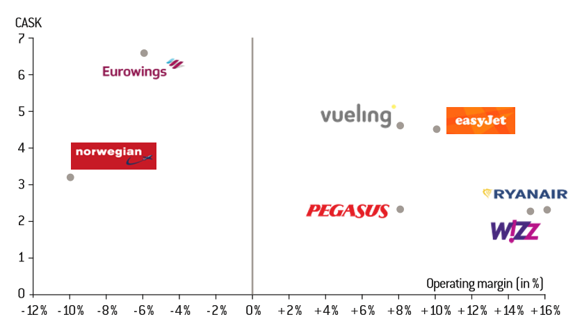 Second, ultra low-cost has an organisational structure characterised by low- fixed costs compared to variable costs. The stay of aircrafts on the ground therefore reduces a significant proportion of variable costs, like kerosene: the first cost item, fuel, represented 29% of variable costs at Wizz Air in 2018 and even reached 35% at Ryanair. Similarly, staff costs, which are almost a fixed cost, accounted for only 10% of the total cost for Wizz Air and 13% for Ryanair.