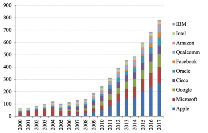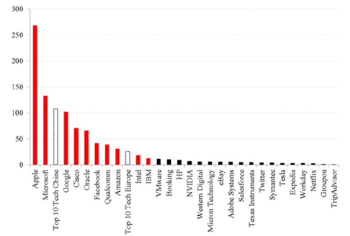 Graph 1: The world’s leading tech companies’ cash positions at the end of 2017 in billions of dollars (US)