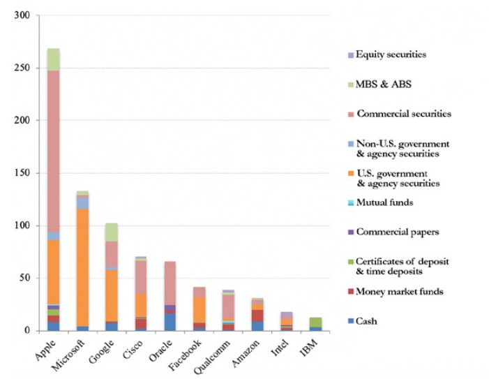 In order to identify the companies of interest for this study, we will begin by comparing the cash position of the main global tech companies at the end of 2017. In practice, a company’s cash position is a financial portfolio that typically includes pure cash and bank deposits, but also various types of liquid securities such as commercial papers, notes, bonds, etc.