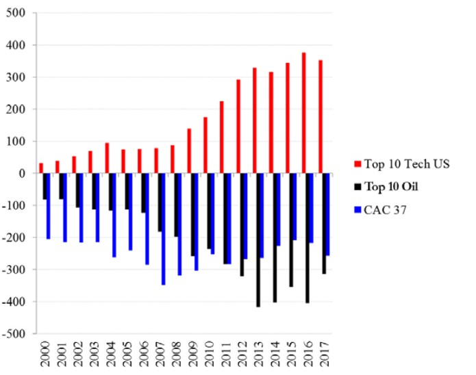 The results speak for themselves, with “Top 10 Tech US” currently holding 3.5 times more cash and marketable securities than “Top 10 Oil” (compared to 1.8 times at the end of 2000) and approximately 2.9 times more than “CAC 37” (compared to 0.7 times at the end of 2000). The growth of cash and marketable securities among the American tech giants was therefore on a completely different scale to that of the main traditional companies.