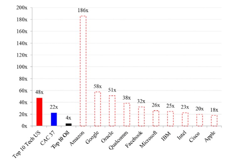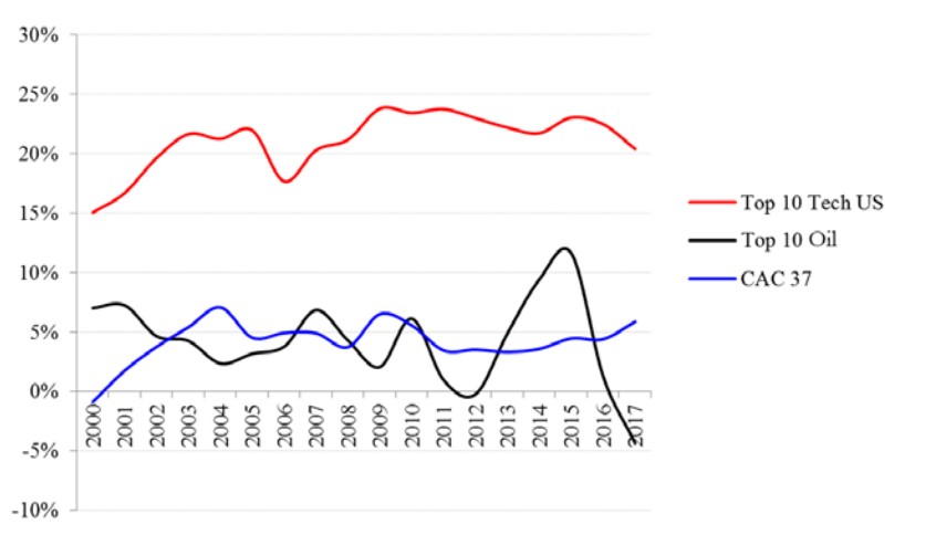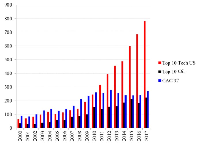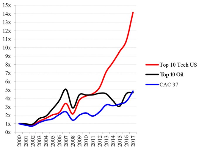 Statistics show us that big tech companies converted 21% of sales into free cash flow between 2000 and 2017, which, in relative terms, makes them five times more profitable than the oil giants and the CAC 37 companies, whose mean proportion was just over 4%. To appreciate the full implications of this observation, it is worth noting that the 20% conversion of sales into free cash flow in 2017 generated no less than $185 billion. The tech giants’ ability to sustain this level of performance over the long term is truly remarkable.