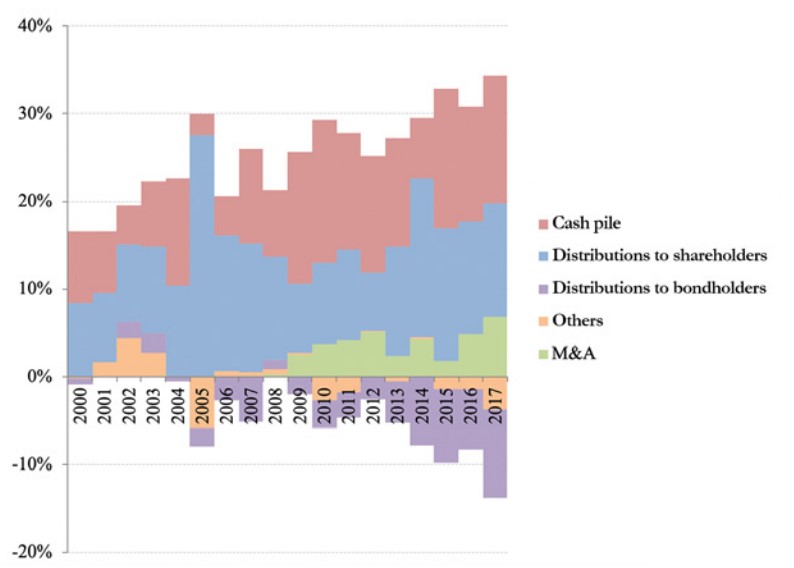 Hence, profits clearly outstrip any requirements in terms of financing new investments (capital expenditures and mergers and acquisitions) and shareholder remuneration. Every year, the resulting “residual” financial surplus, which has no real use in the productive process, augments the cash positions that we examined earlier.