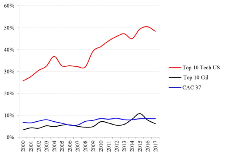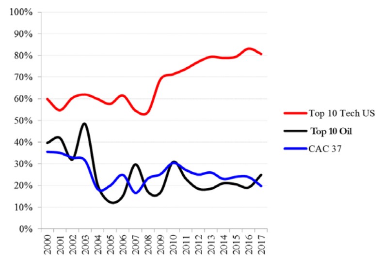 Having analysed cash flows, we will now go back to stocks. We note that by allocating a significant share of the extraordinary profits generated by their business activities to their cash positions, the tech giants have prompted a gradual “financialisation” of assets on their balance sheets. Indeed, while the cash and marketable securities of the oil giants and the CAC 37 companies as a percentage of their total assets remained constant on average at approximately 6% and 8% respectively between 2000 and 2017, it rose almost uninterruptedly for the technology giants, from 26% at the turn of the 21st century to 48% seventeen years later.