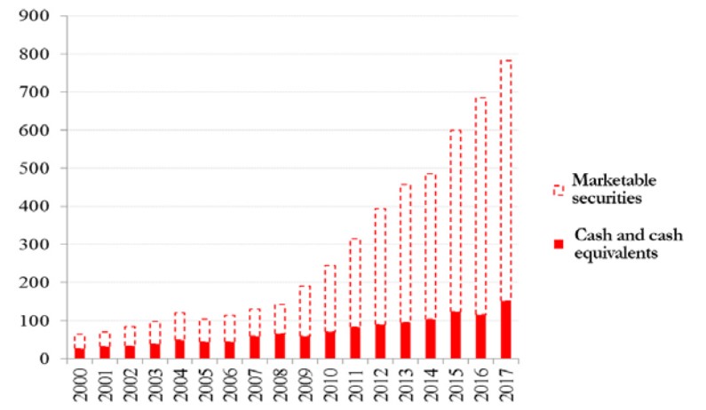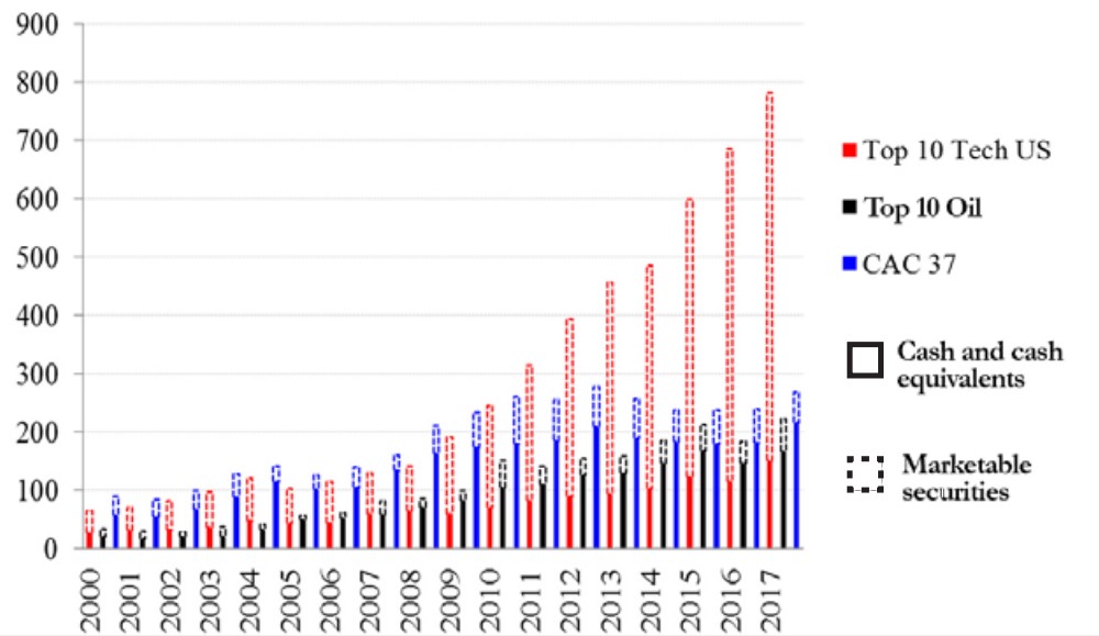 Between 2000 and 2017, the cash and marketable securities of the Top 10 Tech US shot up from €64 to €782 billion, representing 16% mean annual growth. This was particularly pronounced between 2008 and 2017, with 21% mean annual growth (compared to 10% between 2000 and 2008).