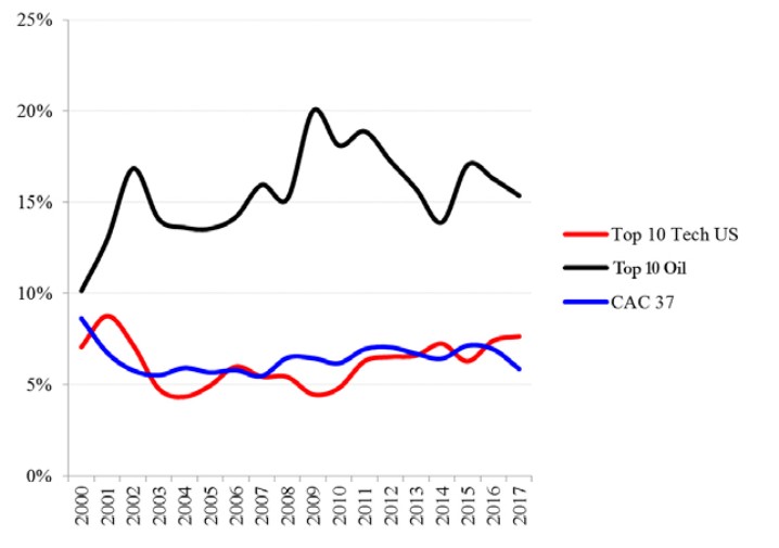 Considering the bigger picture, we decided it would be useful to compare these amounts with those seen in the oil industry, which includes companies that are considered to be particularly powerful and rich, and also with those of the “CAC 37”, which encompasses the main French companies included in the CAC 40 index (excluding its three banking institutions)6.
