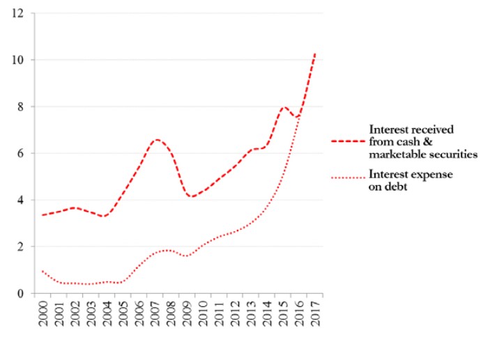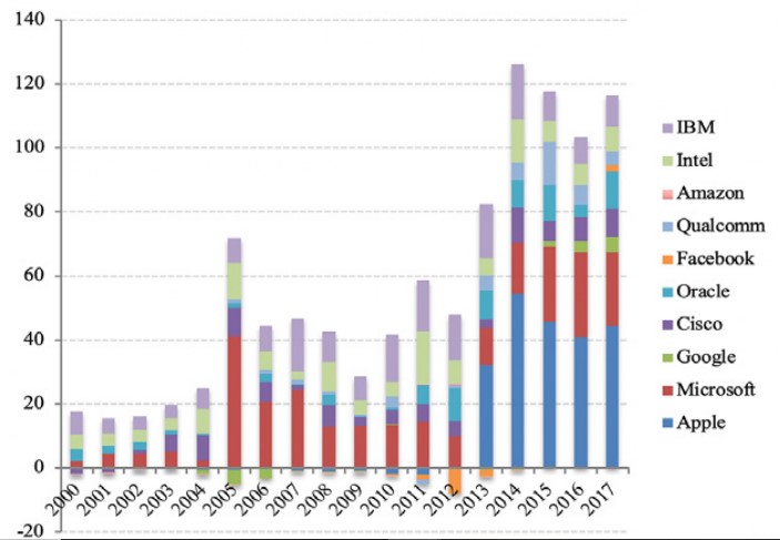 It was indeed much less expensive to pay interest on debts equivalent to the distributed sums than to pay a flat tax of around 35% on the same repatriated Note that big tech companies make extensive use of tax avoidance techniques to register their profits made overseas in jurisdictions where tax rates are extremely low (Ireland, Luxembourg, etc.). We may therefore assume that although their effective tax rate in the event of repatriation would, strictly speaking, be lower than 35%, it would not be far off this figure.