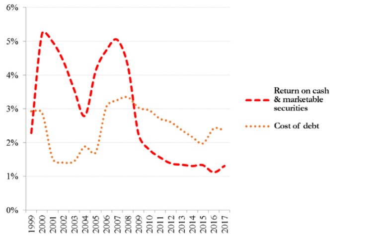On closer examination of the dynamics of each company in the Top 10 Tech US sample, we note that the top 5 now account for 82% of the total cash and marketable securities (Apple 34%, Microsoft 17%, Google 13%, Cisco 9% and Oracle 8%) and that the rate of cash growth varies among companies. For instance, between 2008 and 2017, Facebook’s cash position grew at the frenetic annual rate of 73%. Apple (31%), Amazon (27%), Google (23%), Oracle (22%) and Microsoft (21%) are above the mean level, while Intel (5%) and IBM (0%) are below it.