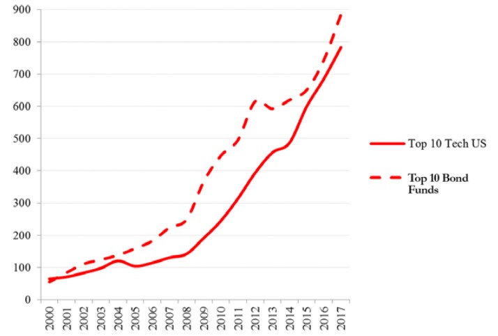 Graph 22: Cash positions of Top 10 Tech US vs. assets under management of top 10 bond funds in billions of dollars (US)