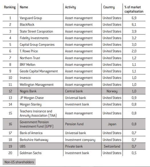 We will initially examine the influence of tech companies’ shareholders in decisions regarding capital allocation. At present, it is evident that the main shareholders in big tech companies are large American financial institutions (see table 1). While the three overseas entities included in the ranking of the top twenty institutional shareholders do not even hold 3% of the capital, the American asset management giants Vanguard, BlackRock, State Street and Fidelity alone hold over 20%.