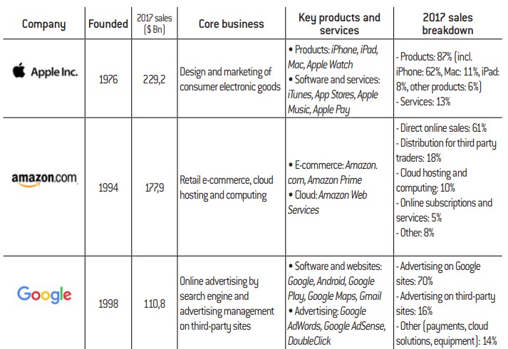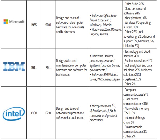 However, the differences between companies in the sample should not obscure significant common features. All offer products or services related to information technology or the Internet and, as we will see later, hold at least one dominant position in one of their markets. Moreover, they all pursue business activities on several of the segments mentioned above. For example, Microsoft is a software developer (OfficeSuite), hosting and computing service provider (through Microsoft Azure), and electronic equipment producer (Surface computers and tablets, Xbox consoles, etc.). While Amazon is mainly known as an e-commerce platform, the company also provides hosting and cloud computing solutions (through Amazon Web Services) and develops and markets software integrated in electronic devices (Kindle tablets, Amazon Echo, etc.).