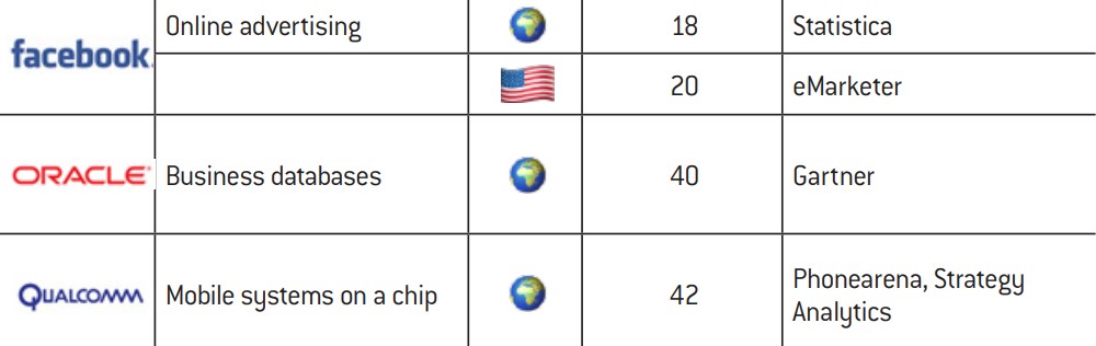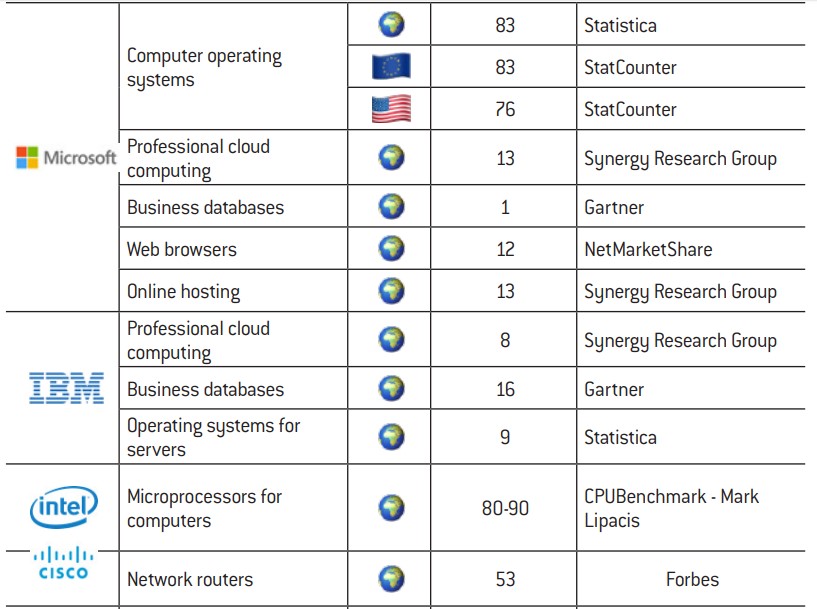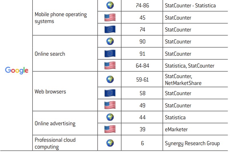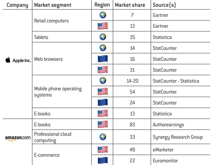 We have also opted to take a pragmatic approach to the notion of markets by basing our analysis on other factors than revenues. The data that we collected are presented in Appendix 2 (c). Market shares quoted by different sources vary as they are difficult to assess. Nevertheless, a general picture indisputably emerges of big tech companies holding ultra-dominant positions on a number of technologies and related businesses. The numerous examples of this include Google’s supremacy in online searching in Europe (90% market share), Microsoft’s global domination of operating systems for computers (80% market share) or Amazon’s hegemony on e-books in the United States (83% market share). As a guideline, the European Commission considers market share of over 40% to be a potential indicator of a dominant position, while the DoJ suspects businesses with a market share of 50% or above of holding monopolies. Beyond the static figures, it is worth also considering their dynamics. For instance, Google and Facebook absorb together around 90% of the growth in the US online advertising market9.