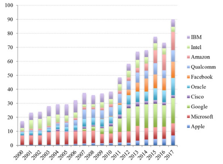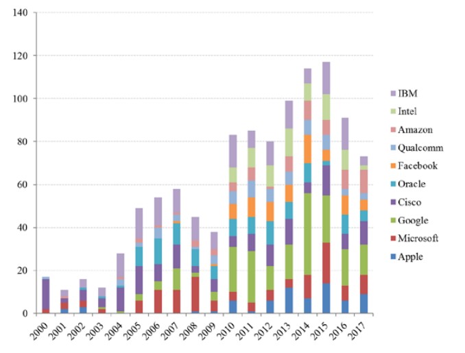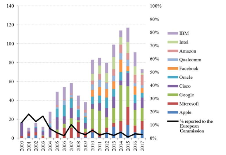 After the big tech companies’ persistently huge profits, this growing market concentration is a second sign of reduced competitive intensity in the sector. It is worth noting the clear vicious circle that exists between these two processes, in that the concentration of innovation helps maintain abnormally high profits, while these earnings enable tech giants to acquire any emerging competitors or promising technology.