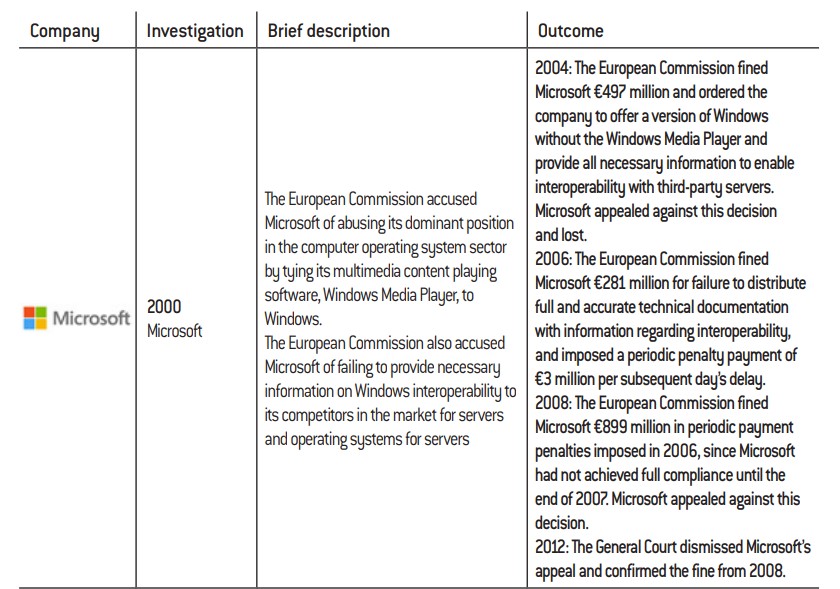 Appendix 2(e) Key cases of abuse of dominant position involving the big tech firms in Europe since 2000: