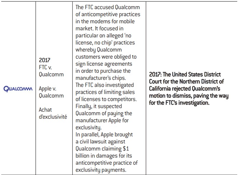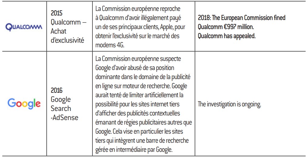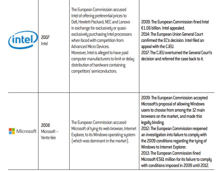 Vestager, took office. Google has been faced with a series of actions, which have regularly made the front pages. The company from Mountain View was first fined €2.42 billion in 2017 for favoring its own online comparison shopping service on Google Search over rival services. Then, in 2018, the European Commission fined Google €4.34 billion for anticompetitive practices concerning its licenses for the Android mobile operating system. The company required smartphone manufacturers to pre-install Google applications as a condition to be granted a license for the Google Play app store. Far from the spotlights and public attention, the tech giants have also been called out by the European Commission for anticompetitive practices concerning hardware – just this year, Qualcomm was fined €997 million for paying mobile manufacturers to exclusively use its modems. Intel still has a €1.06 billion fine from 2009 hanging over it for similar practices in the computer microprocessor market. We note that the penalized companies appeal these administrative decisions in most cases.