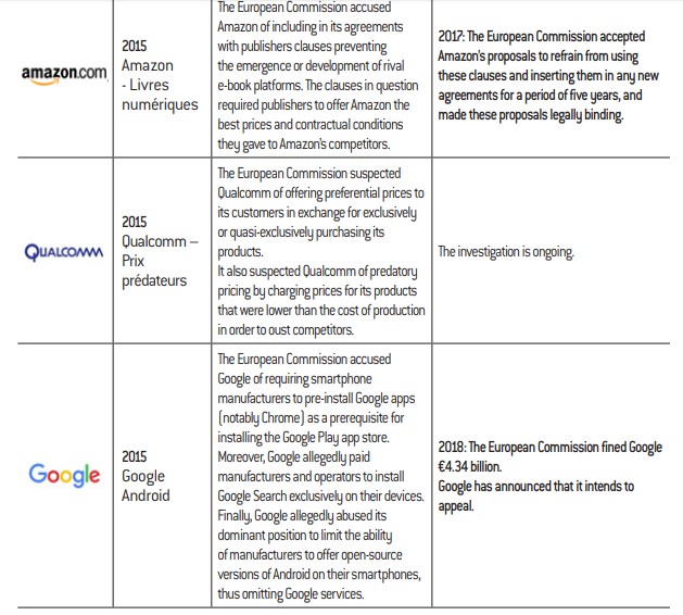 We have examined all antitrust cases involving the tech giants at Community level in the European Union and at federal level in the United States. Readers seeking a comprehensive overview should refer to Appendices 2(e), 2(f) and 2(g). In Europe, there have been increasingly frequent administrative decisions penalizing big tech companies for anticompetitive practices since 2014, the year in which the current European Commissioner for Competition, Margrethe