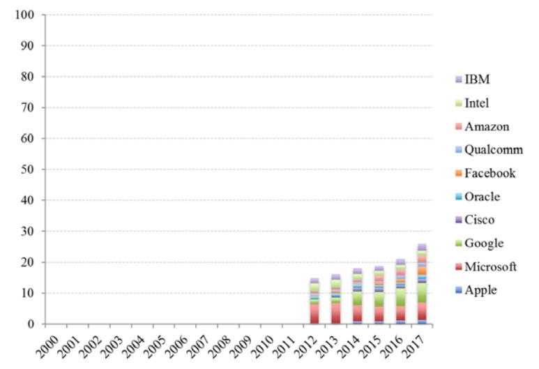 Consequently, the chances of a new tech giant emerging to overturn the established order of the big tech firms appears extremely remote. After the boom of companies focused on computers (Apple, Microsoft, IBM, Intel, Qualcomm, etc.), the Web (Google, Amazon, Facebook, AirBnb), and smartphones (Uber, Instagram, WhatsApp, Snapchat), it is unclear whether new tech titans will emerge in the coming years. Indeed, as some observers8 have quite rightly pointed out, the technologies that are currently considered most promising for the next decade are not really conducive to the emergence of new tech giants. Indeed, they all present significant barriers to entry: driverless cars (huge R&D expenditure), virtual or augmented reality (ditto), artificial intelligence (big data required), drones (small margins that are difficult to sustain for new companies), Internet of things (ditto).